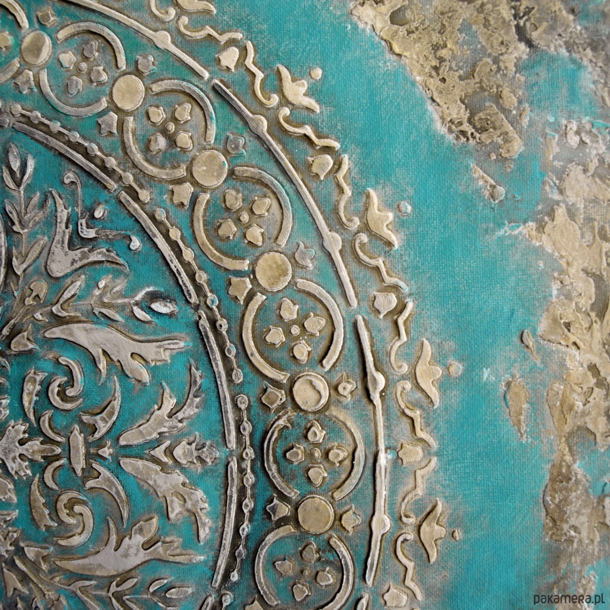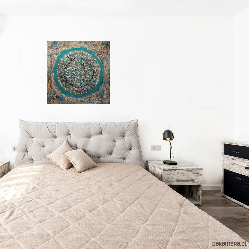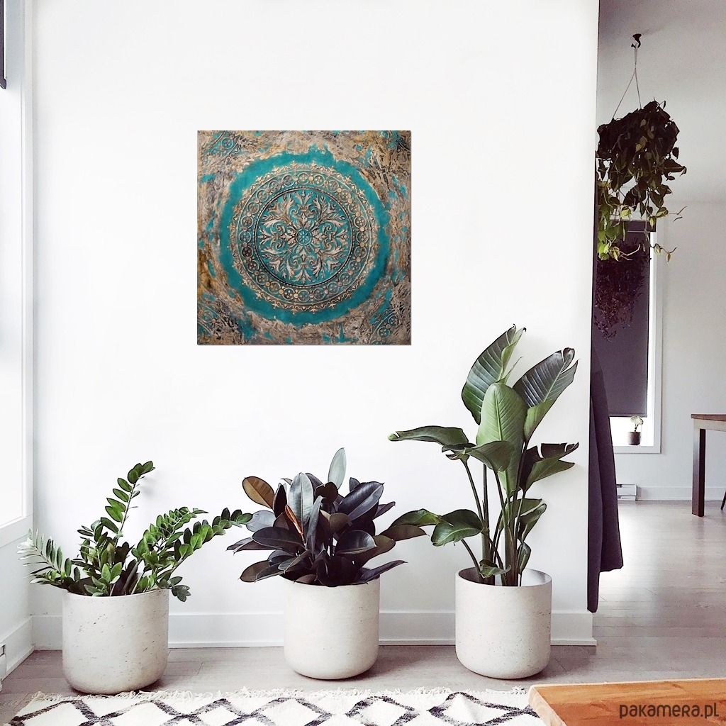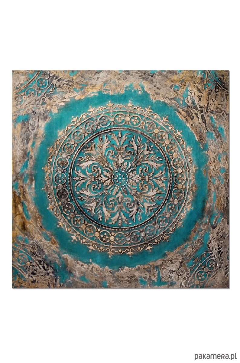 Oryginalna dekoracja - obraz malowany ręcznie w technice akrylowej, z grubą, wypukłą strukturą wzoru, na płótnie naciągniętym na ramę o grubości ok. 2 cm. Format: 70/70 cm. Obraz jest sygnowany, pokryty werniksem dla ochrony przed wilgocią. Boki zamalowane w tonacji całości więc nie wymaga oprawy.