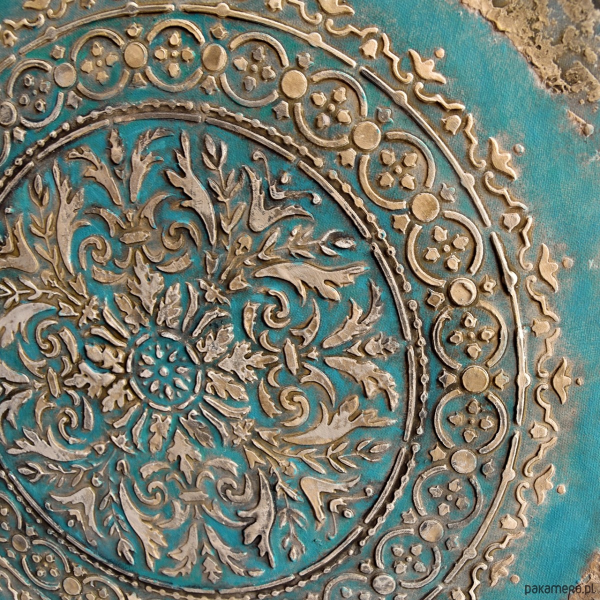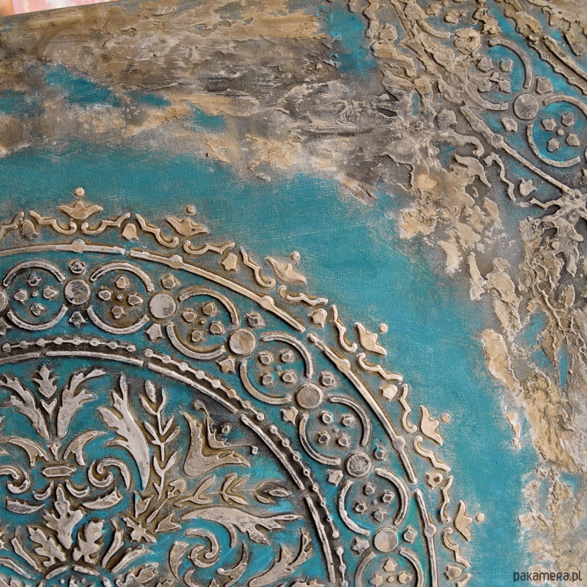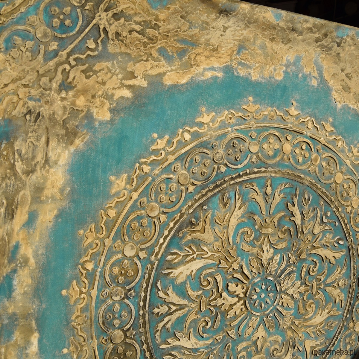 Oryginalna dekoracja - obraz malowany ręcznie w technice akrylowej, z grubą, wypukłą strukturą wzoru, na płótnie naciągniętym na ramę o grubości ok. 2 cm. Format: 70/70 cm. Obraz jest sygnowany, pokryty werniksem dla ochrony przed wilgocią. Boki zamalowane w tonacji całości więc nie wymaga oprawy.