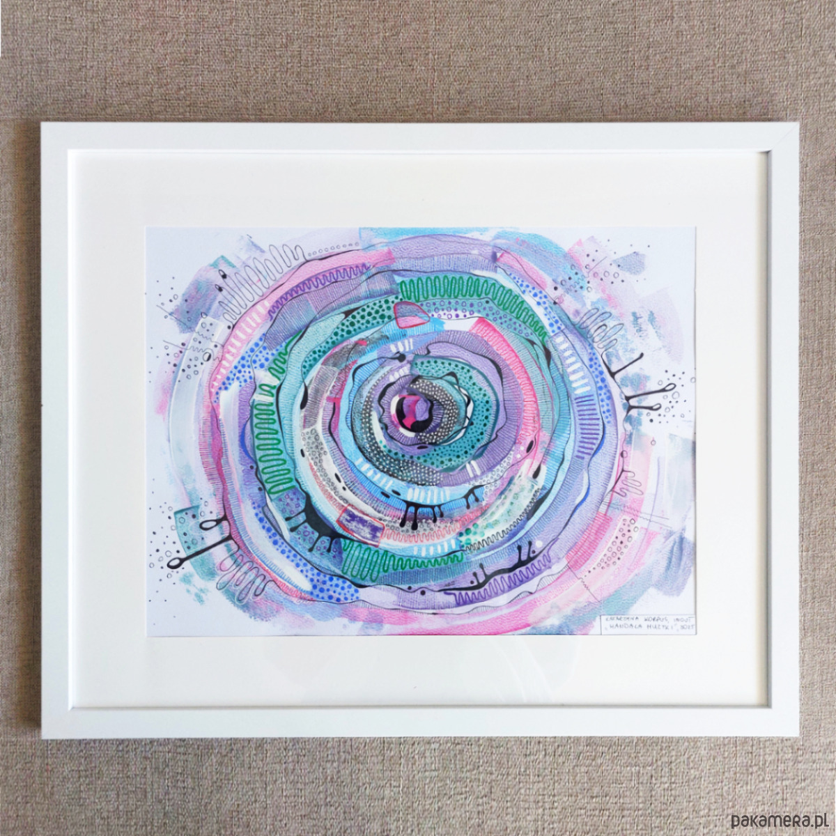 MANDALA MUZYKI to subtelna abstrakcja, która wniesie do Twojego domu radość i energię. To kompozycja inspirowana dźwiękami, tonami, pełna swobody i lekkości... Świetnie sprawdzi się w pokoju dziecka, sypialni, gabinecie i każdej innej przestrzeni, którą chcesz odświeżyć czy rozjaśnić. Sprzedawana jest w klasycznej ramie w kolorze białym z białym passepartout - całość tworzy oryginalny dodatek pełen detalu :) MANDALA to strzał w 10 :)