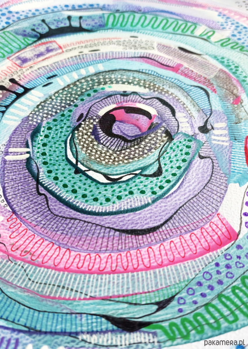 - namalowana farbami akrylowymi i pisakami na arkuszu papieru 300 g,