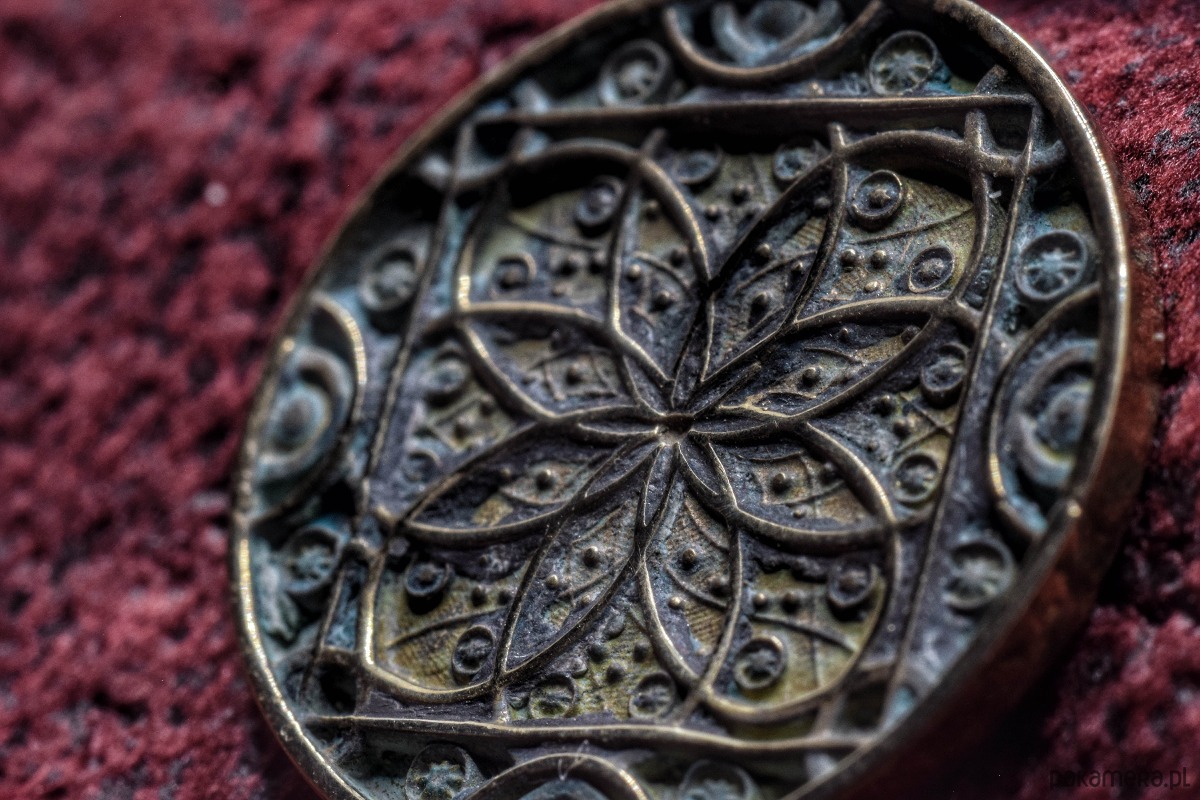 Wisiorek z geometryczną mandalą odlany w brązie. Z naturalnymi kamieniami (mix). Wisiorek pokryty zieloną patyną.