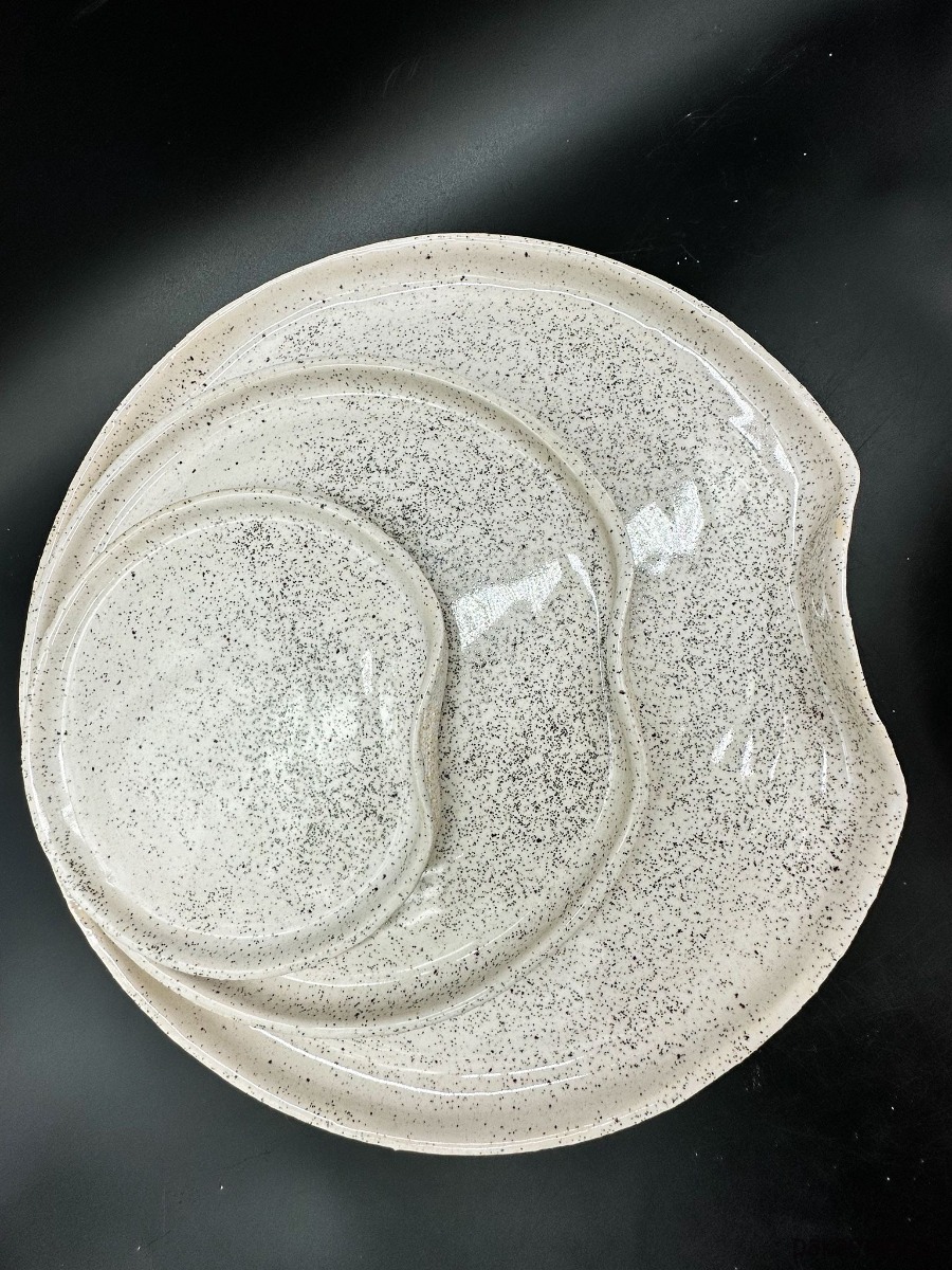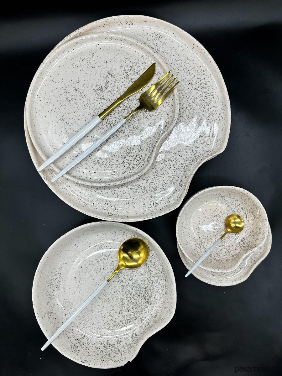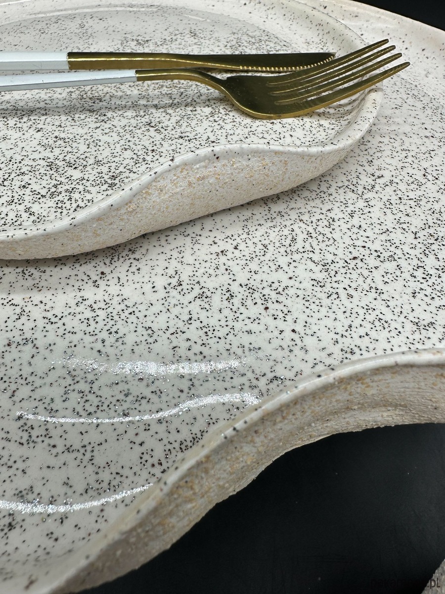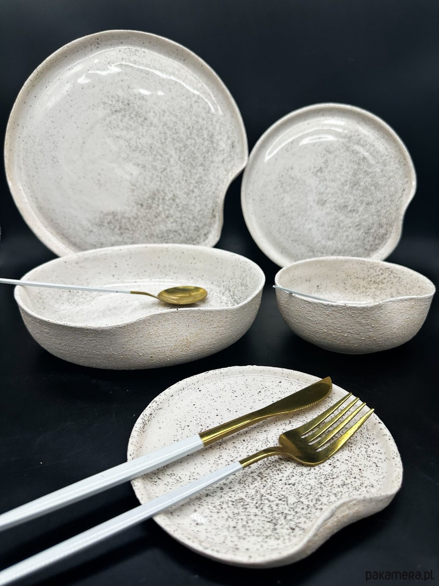 Naczynia pokryte są białym szkliwem z dodatkiem drobnych, mieniących się drobinek brokatu, które tworzą efekt delikatnego, kosmicznego pyłu. Ten subtelny połysk sprawia, że kolekcja wygląda niezwykle elegancko i wyjątkowo — szczególnie w świetle świec lub słońca, gdy brokat ożywa i mieni się niczym księżycowa poświata.