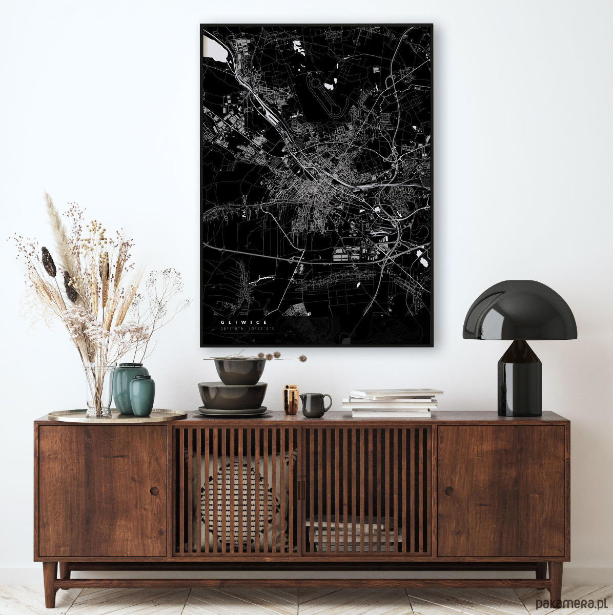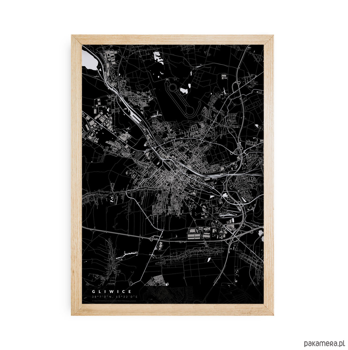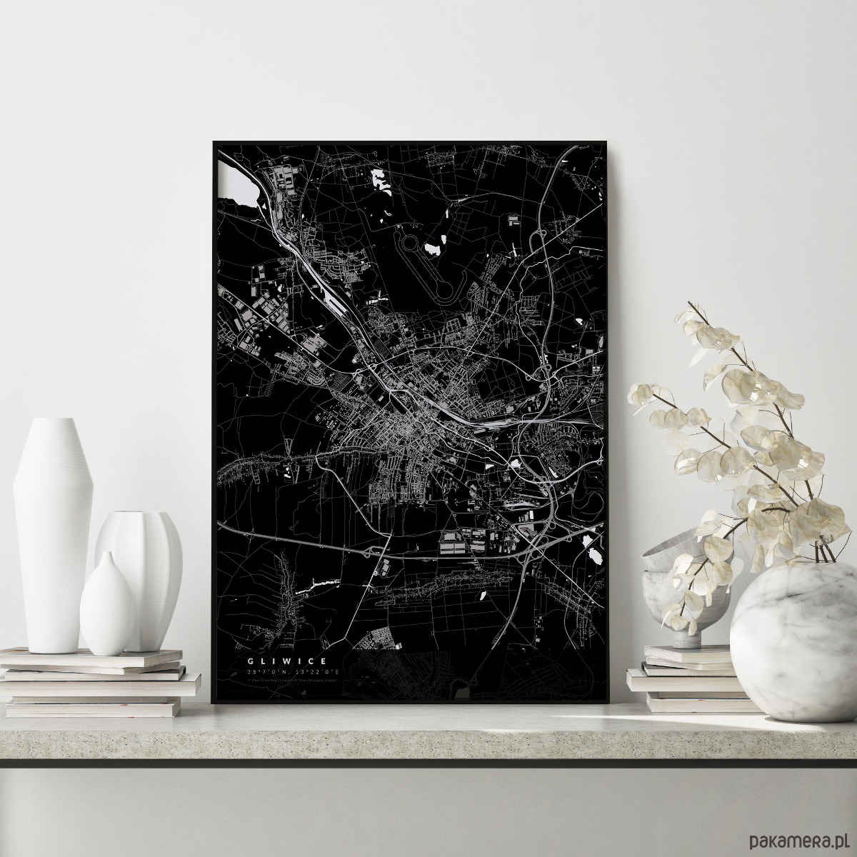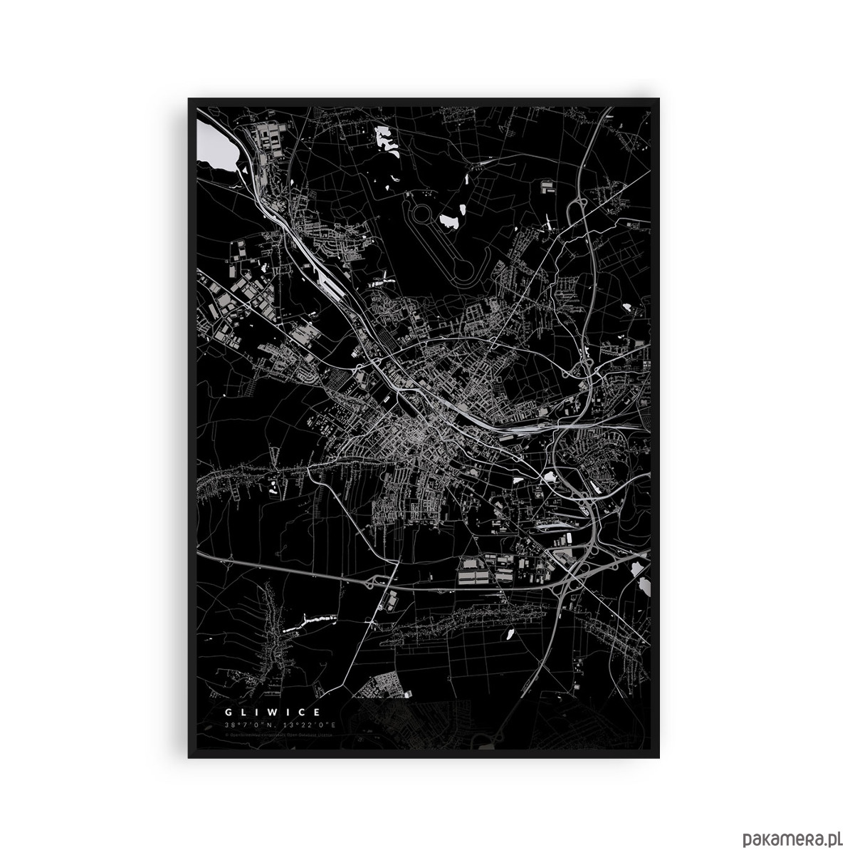 Plakat z mapą Gliwic - wersja ciemna. W innej ofercie dostępna jest także wersja z białym tłem.