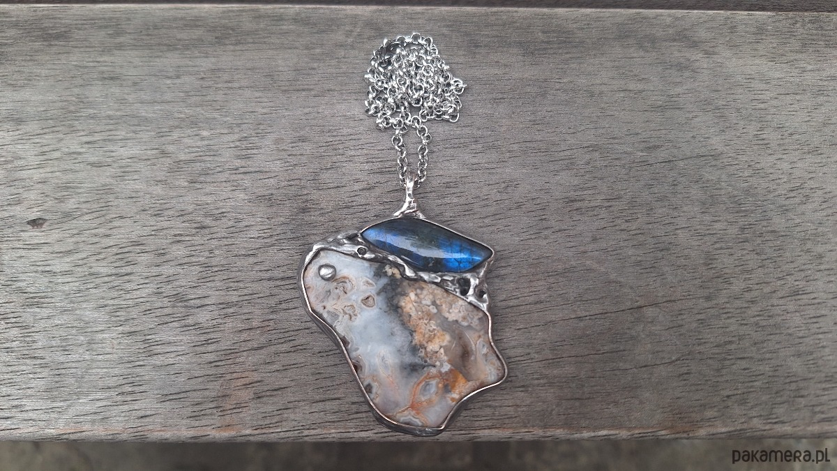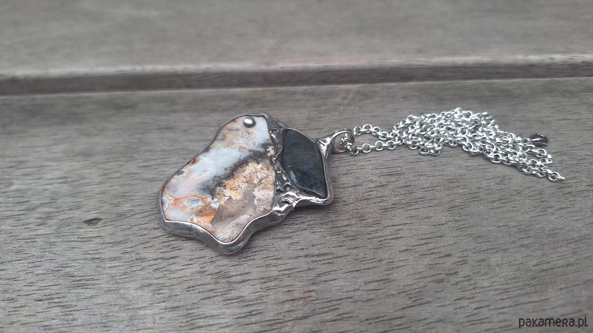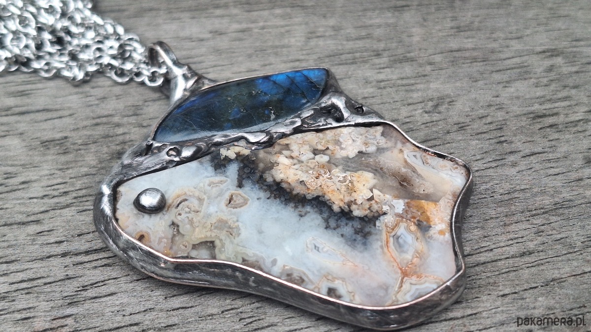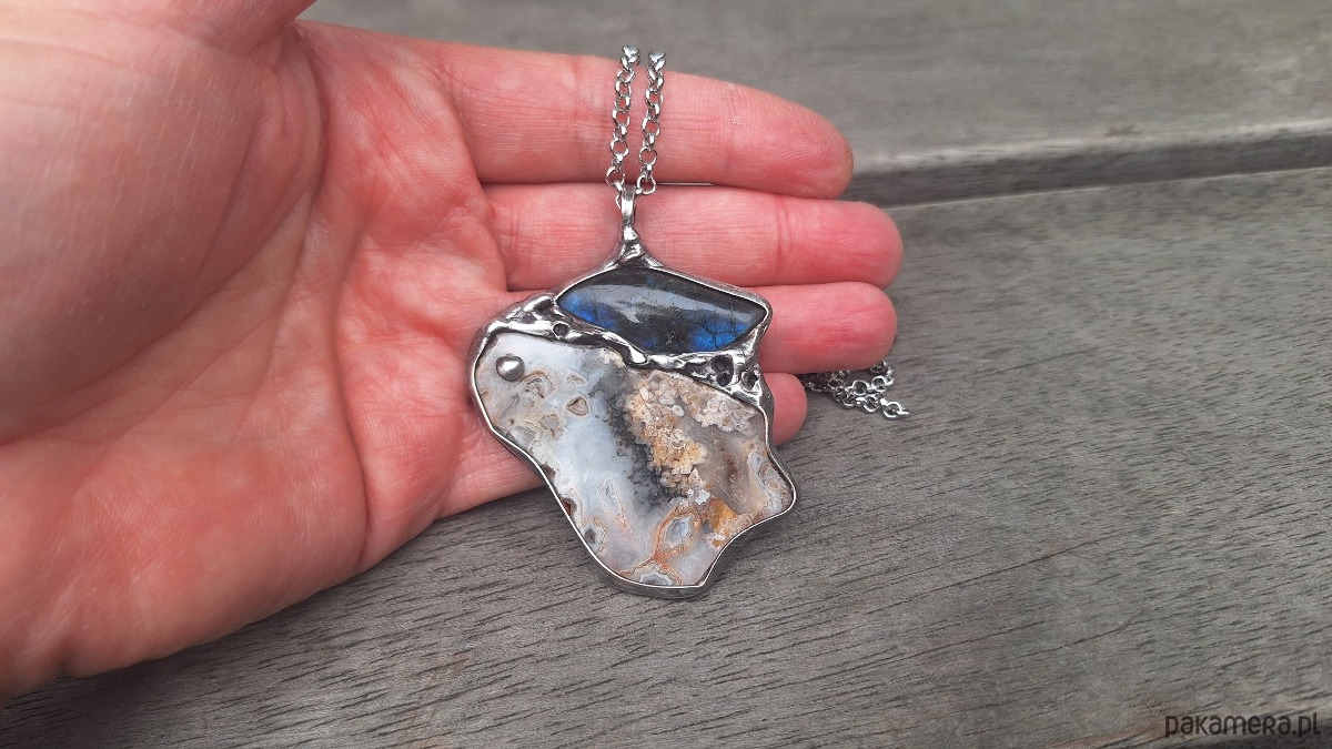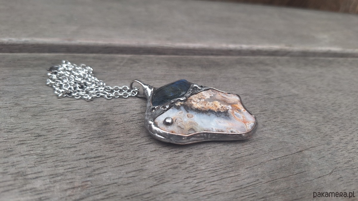 Wisiorek wykonany z miedzi, cyny, labradorytu i agatu crazy lace. Wymiary ok. 5 na 4.5 cm. Zawieszony na łańcuszku o długości ok. 50 cm.
