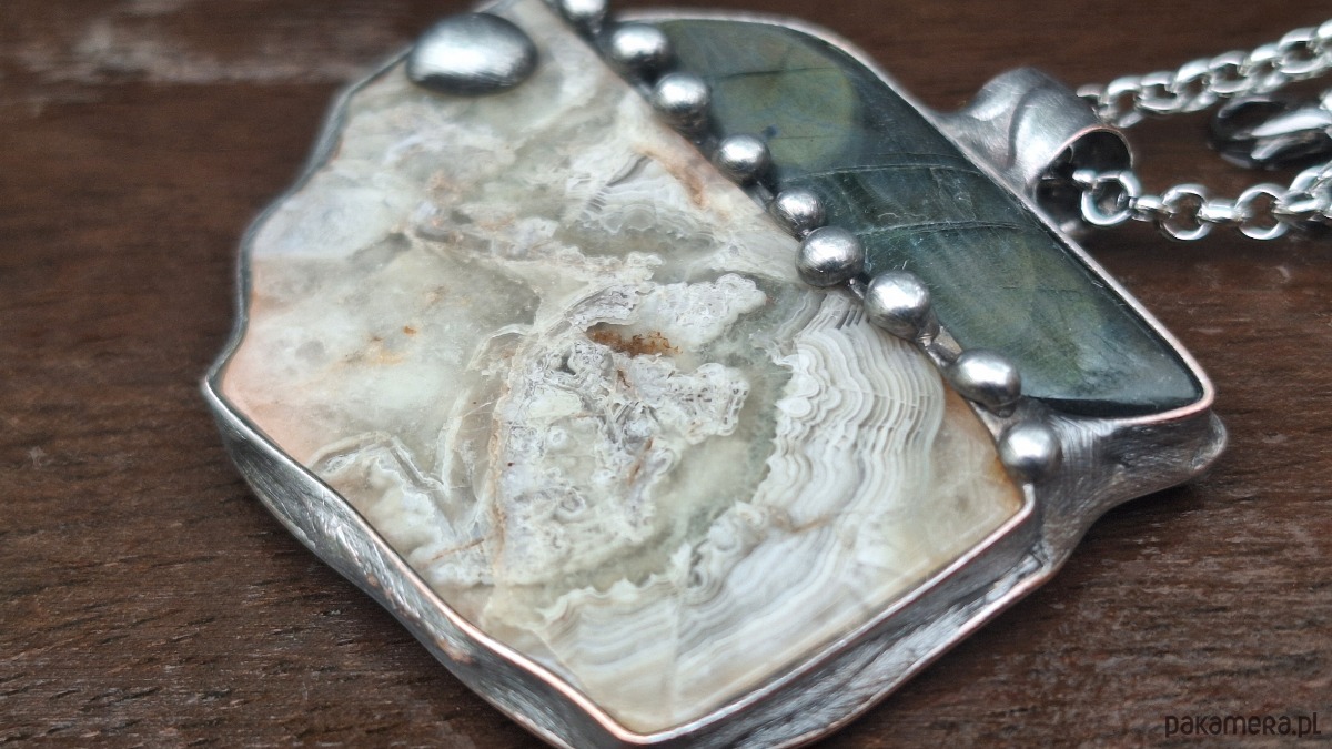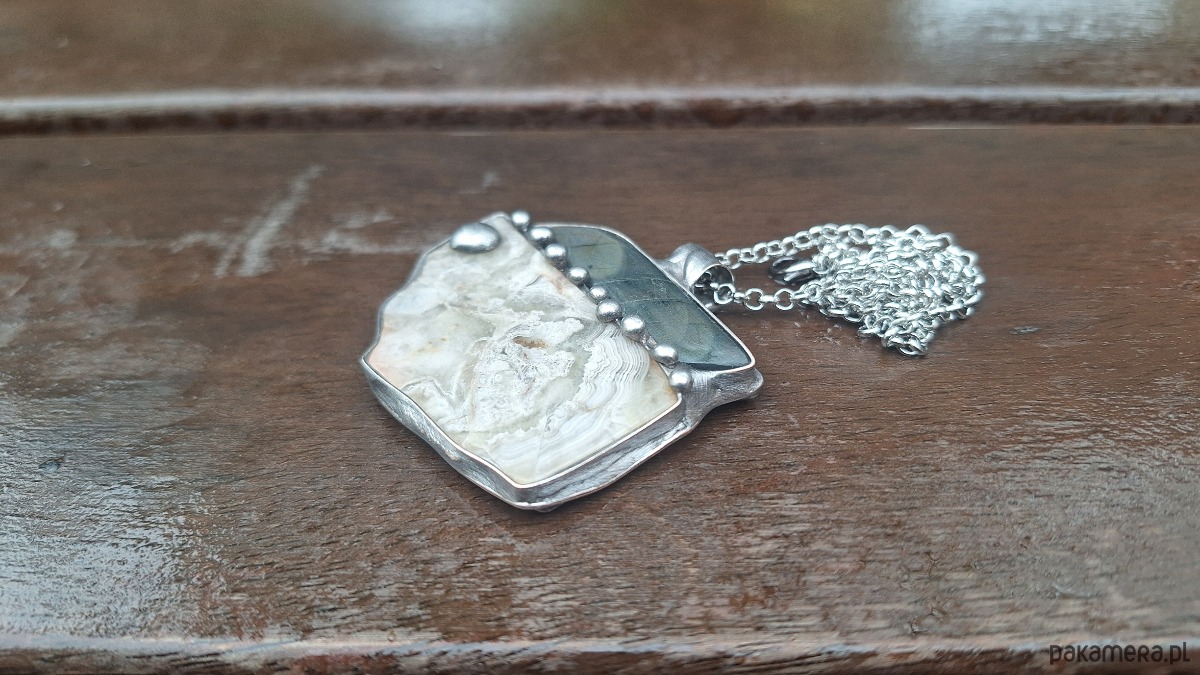 Wisiorek wykonany z miedzi, cyny, labradorytu i agatu crazy lace. Wymiary ok. 4.5 na 5 cm. Zawieszony na łańcuszku o długości ok. 50 cm.