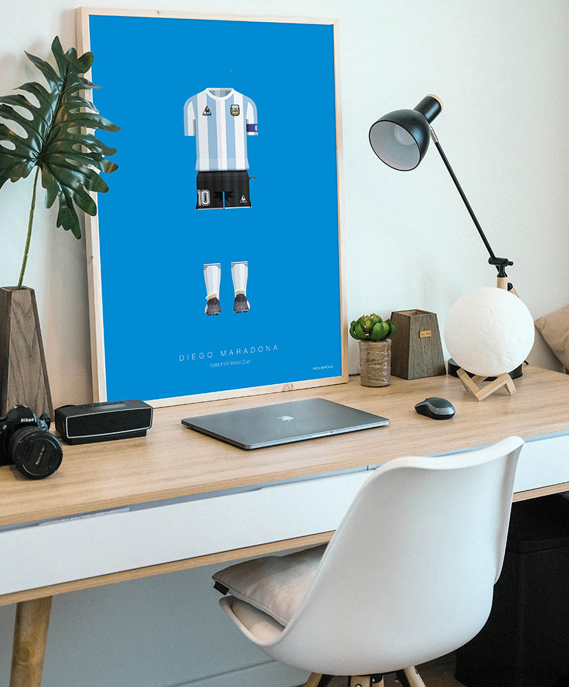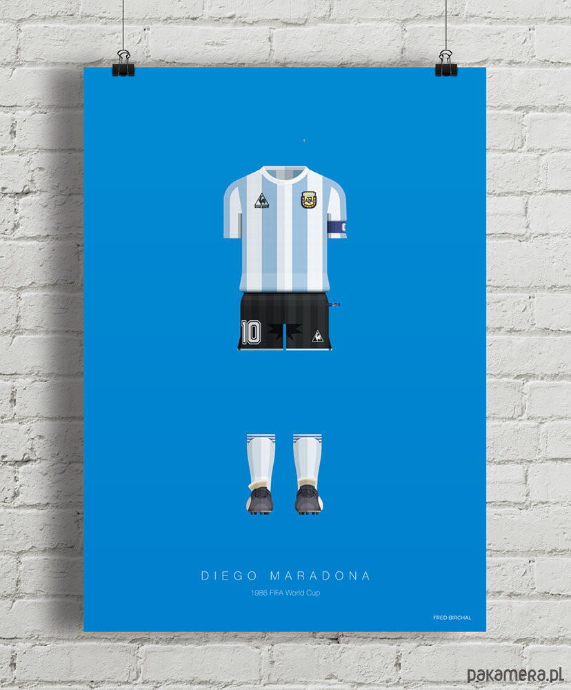 Grafika inspirowana genialnym piłkarzem Diego Armando Maradoną. W 2000 roku został wybrany najlepszym piłkarzem XX wieku wraz z Pelem. Plakat przedstawia jego strój reprezentacji z 1986 roku, w którym Maradona wraz z Argentyną zdobył mistrzostwo świata. Maradona zasłynął jako kultowy zawodnik nie tylko w barwach reprezentacji - dla neapolitańczyków do dziś ma status piłkarza wszech czasów.