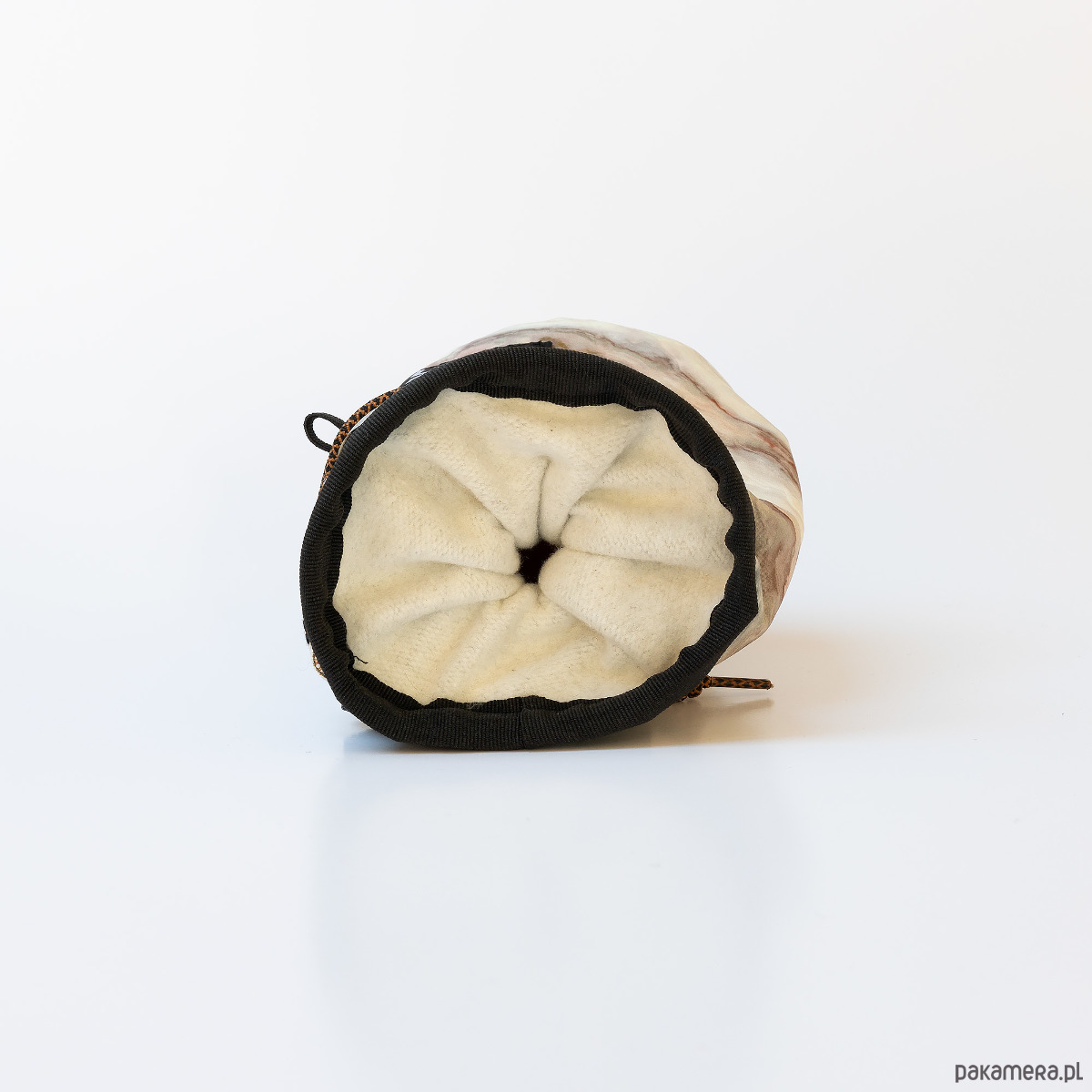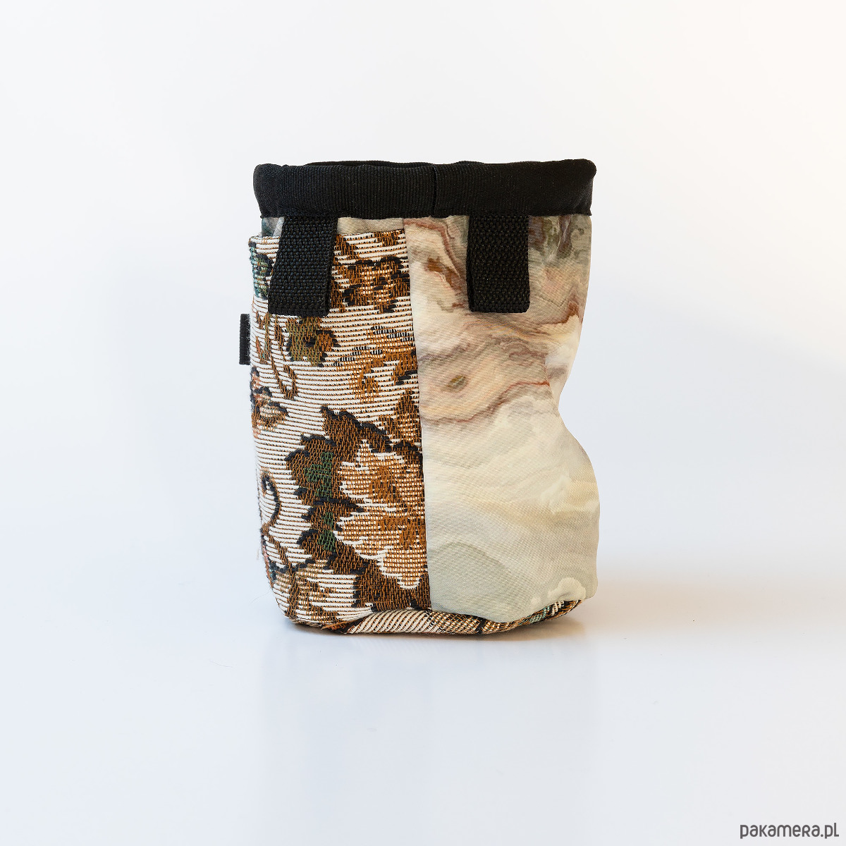 Woreczek wspinaczkowy na magnezję wykonany z różnej jakości tkanin.