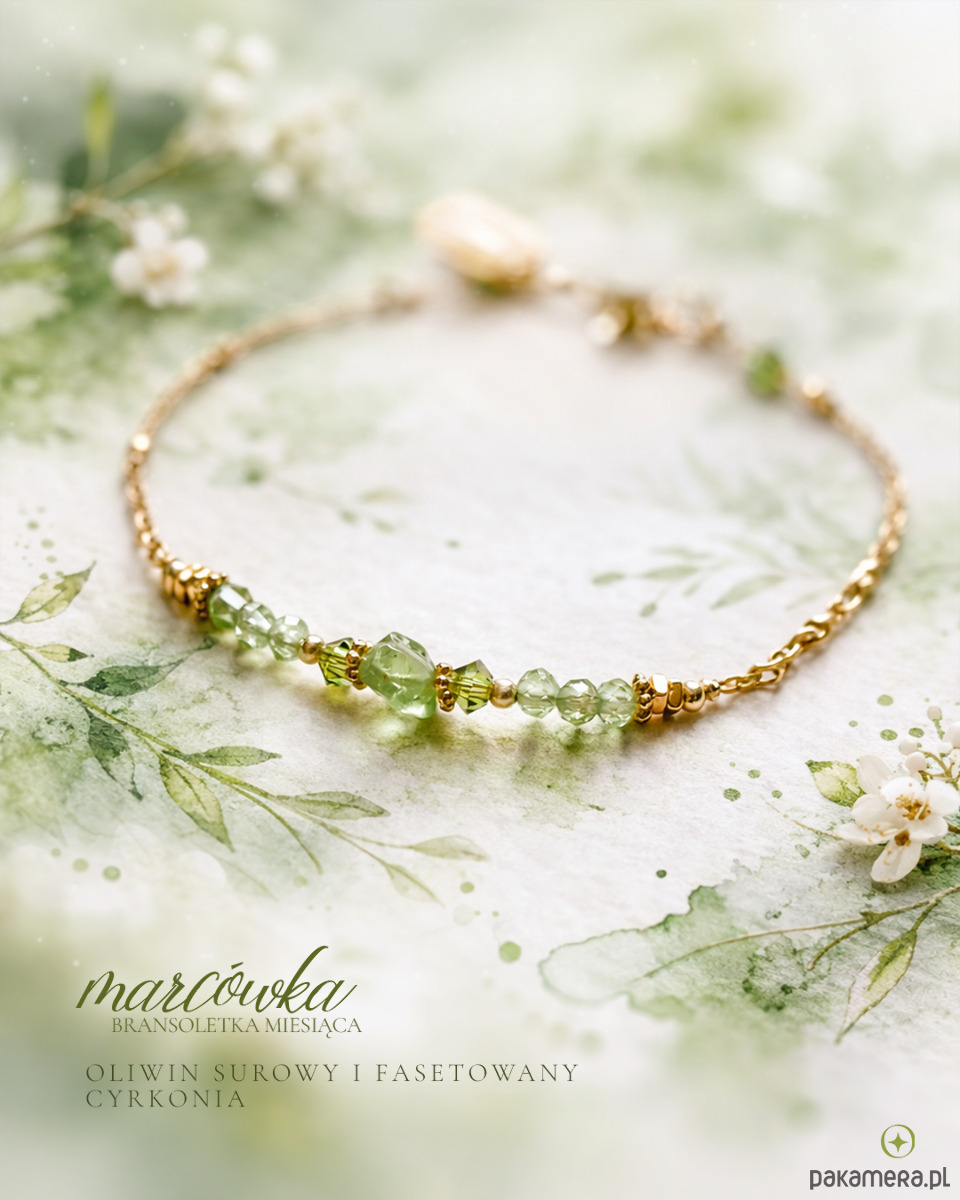 Jak wyglądałby marzec gdyby był bransoletką? Ten miesiąc to przede wszystkim utęskniona wiosna, pierwsze młode listki, młoda soczystość, a więc kolor zielony. Wybrałam tutaj więc mój prywatnie ulubiony kamień - oliwin. Kolor idealnie oddaje delikatność przedwiośnia. W centrum znajduje się surowa bryłka, ozdobiona po bokach ciemniejszą cyrkonią.