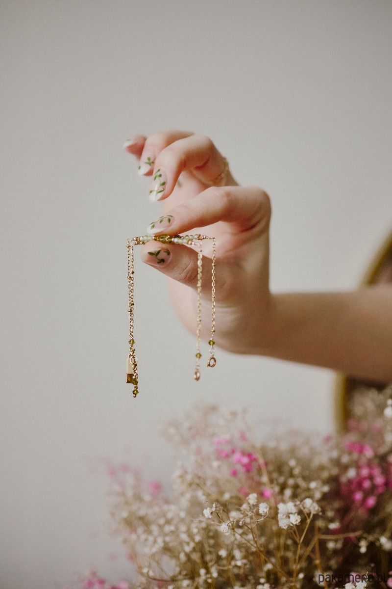 Bransoletka jest zapleciona na delikatnym łańcuszku, pięknie leży na nadgarstku. Tegoroczna seria bransoletek miesiąca przypomina mgiełkę z kryształów.