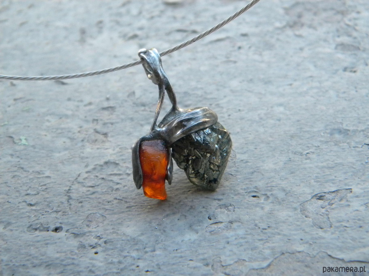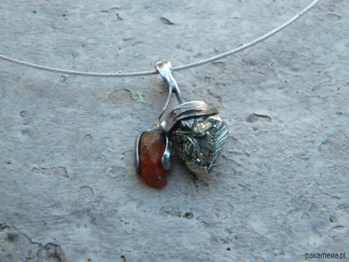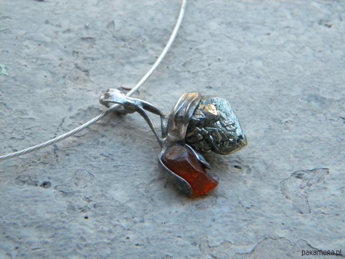 surowy markasyt i surowy bursztyn w oprawie z ocynowanej miedzi.