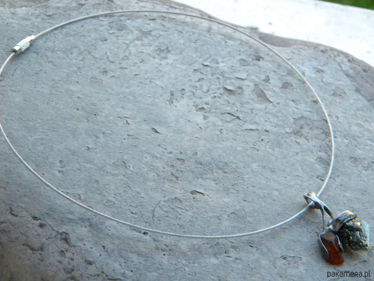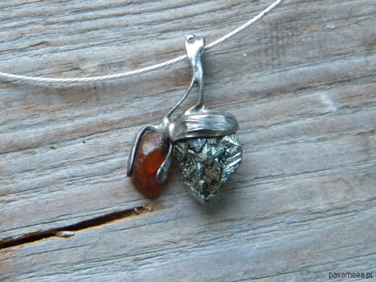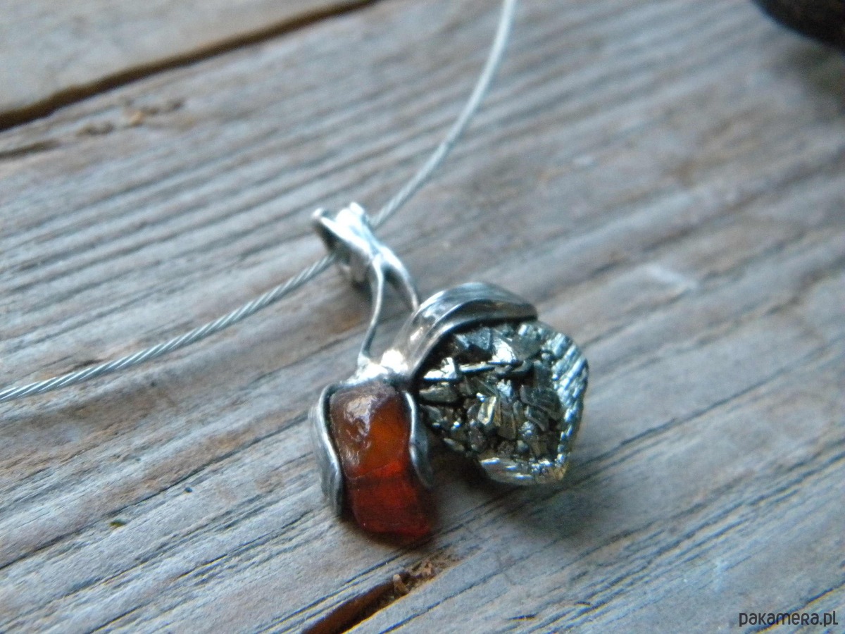 surowy markasyt i surowy bursztyn w oprawie z ocynowanej miedzi.