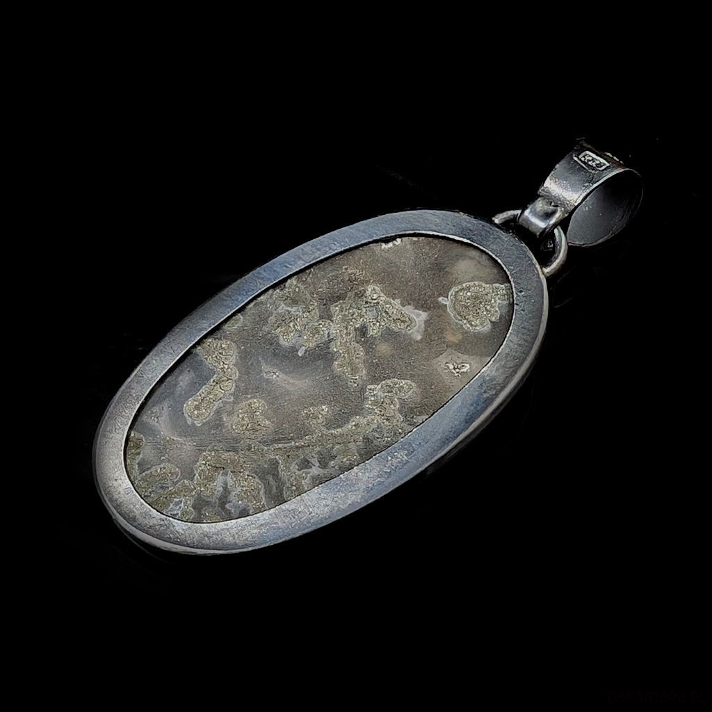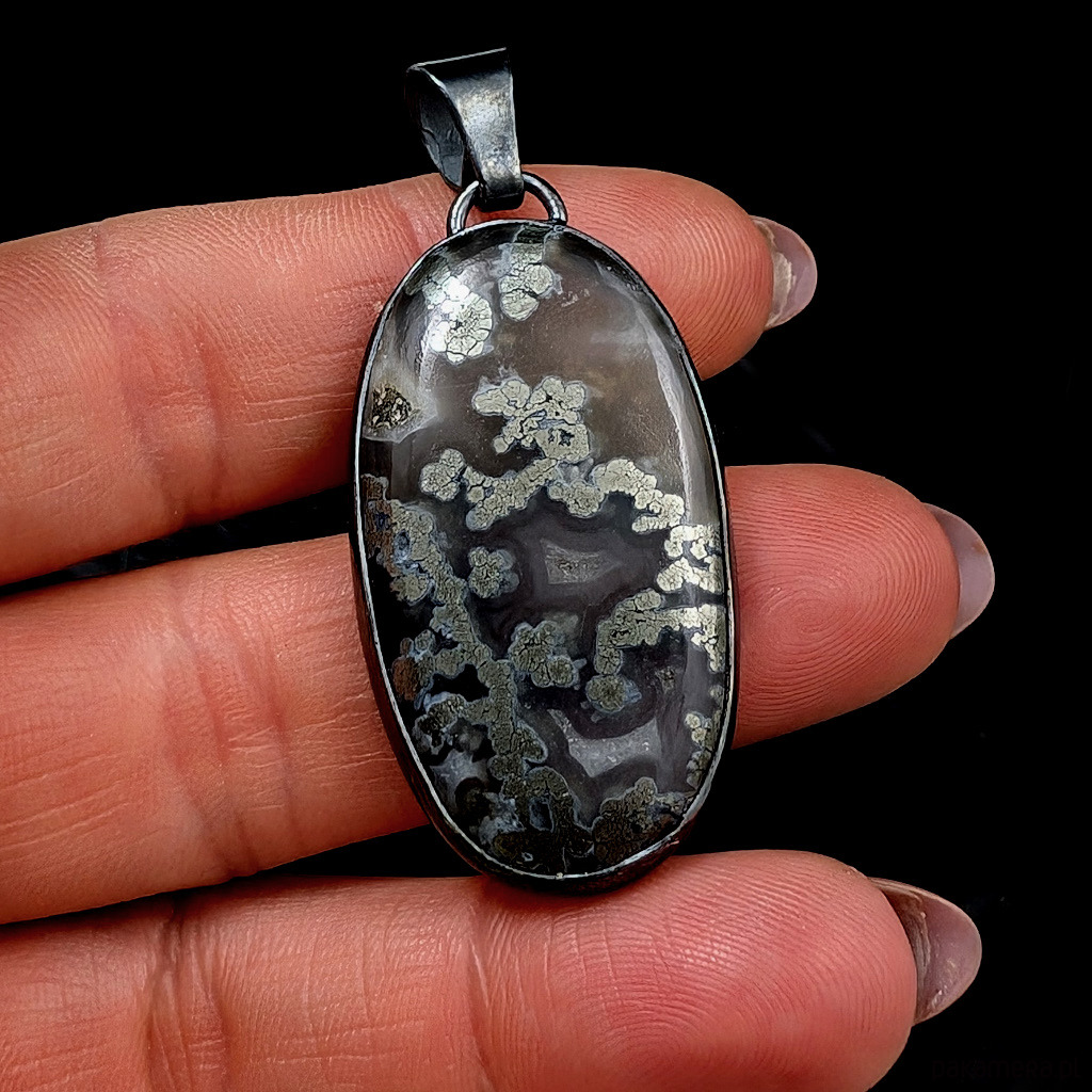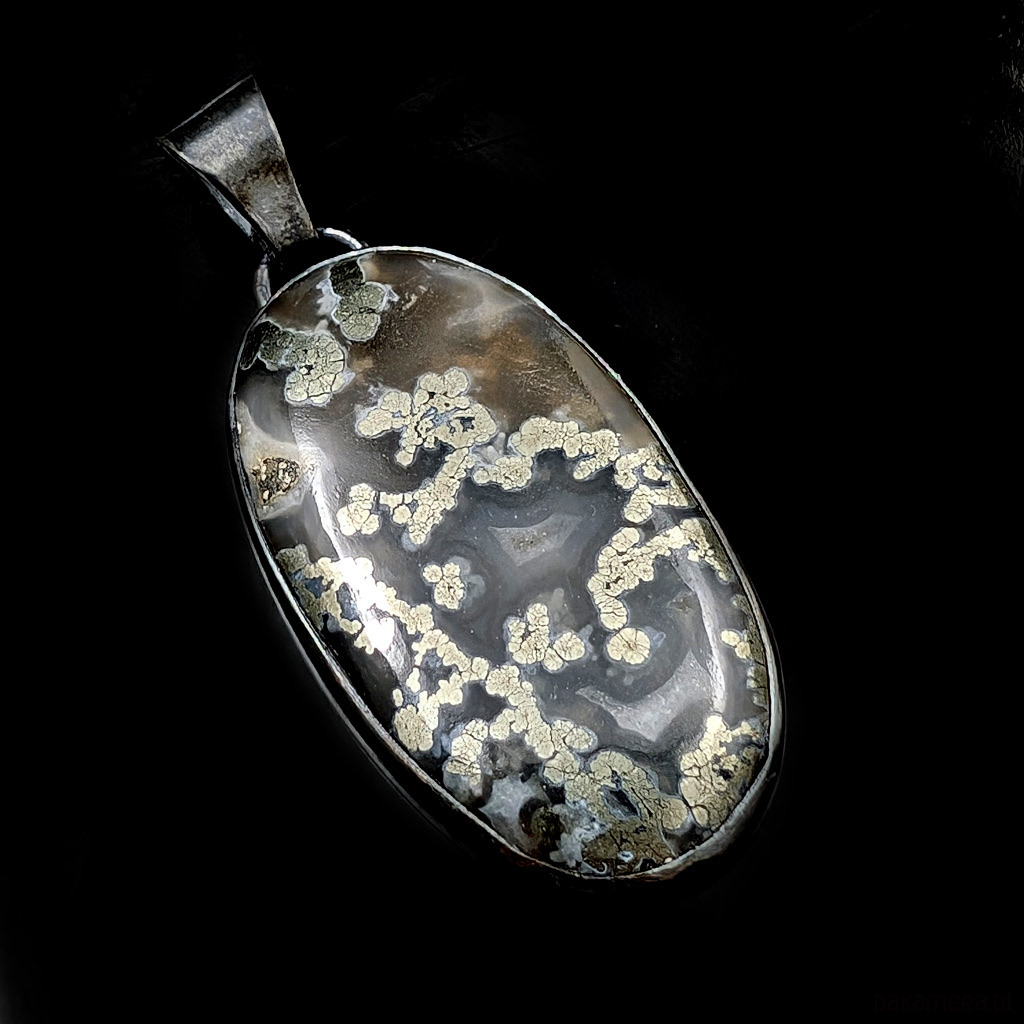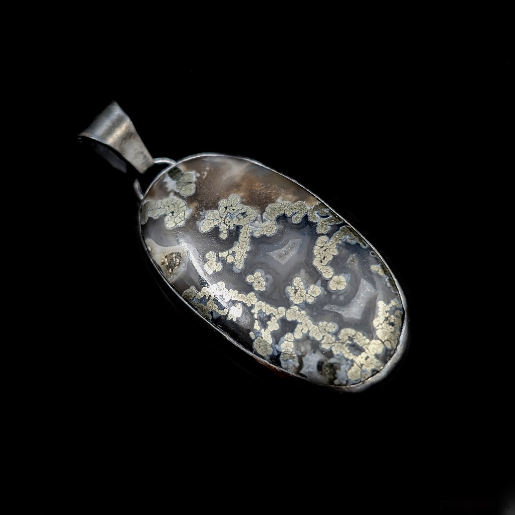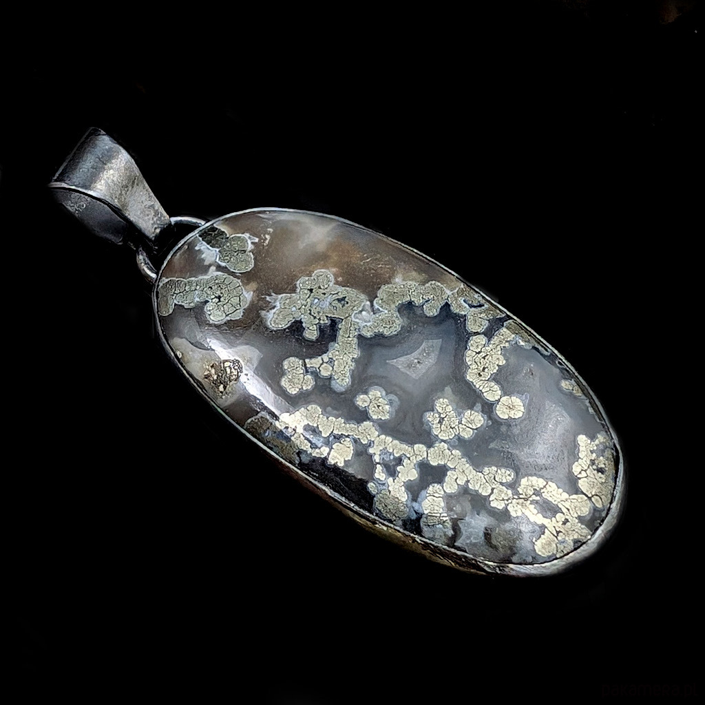 Oryginalny wisiorek wykonany z oksydowanego srebra próby 925 oraz fantastycznego okazu markasytu na kwarcu. Kamień wygląda jak pokryty roślinnymi łuskami. Piękne, mineralne zjawisko. Wymiary 38 x 22 mm, waga to 12 gramów. Zostanie zapakowany w ozdobne pudełeczko.