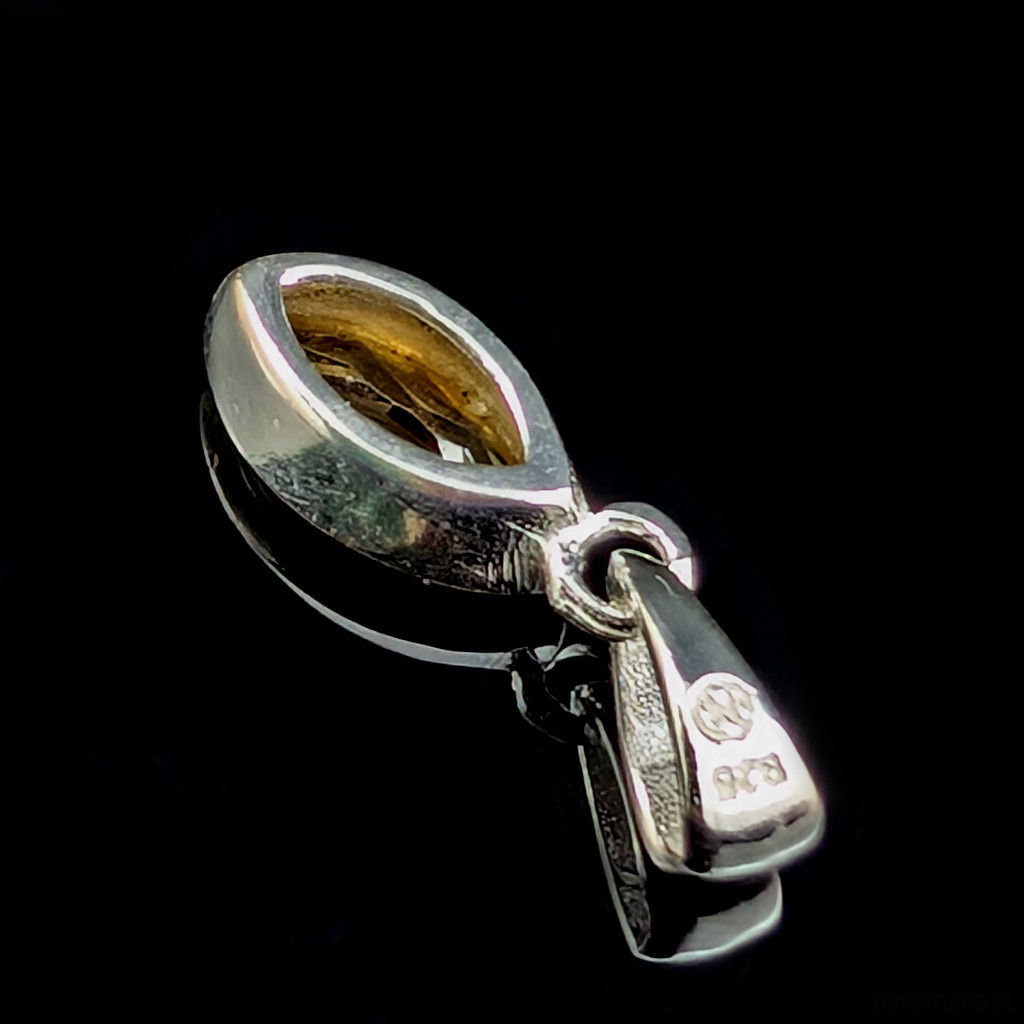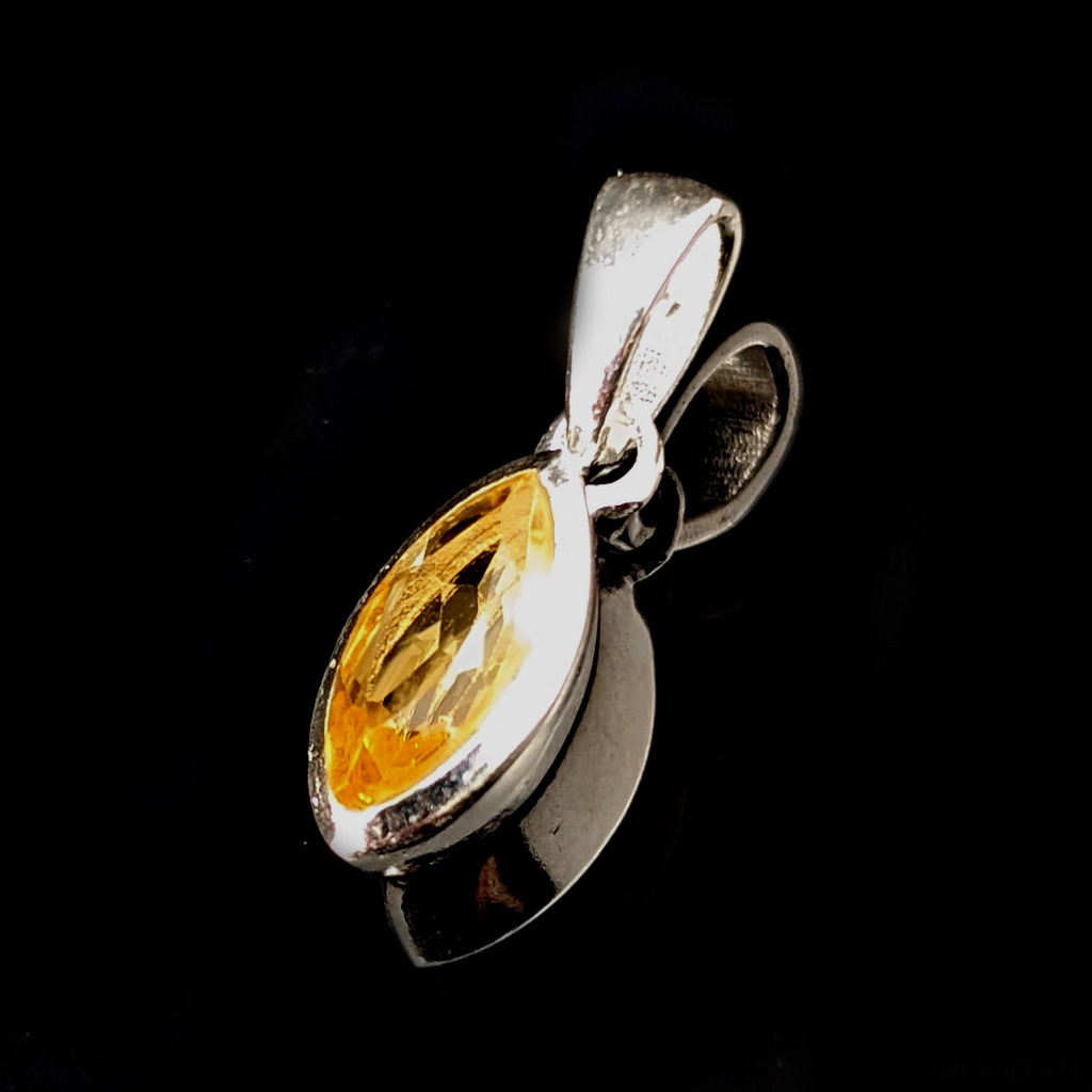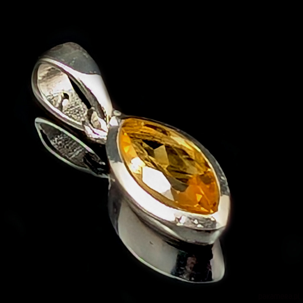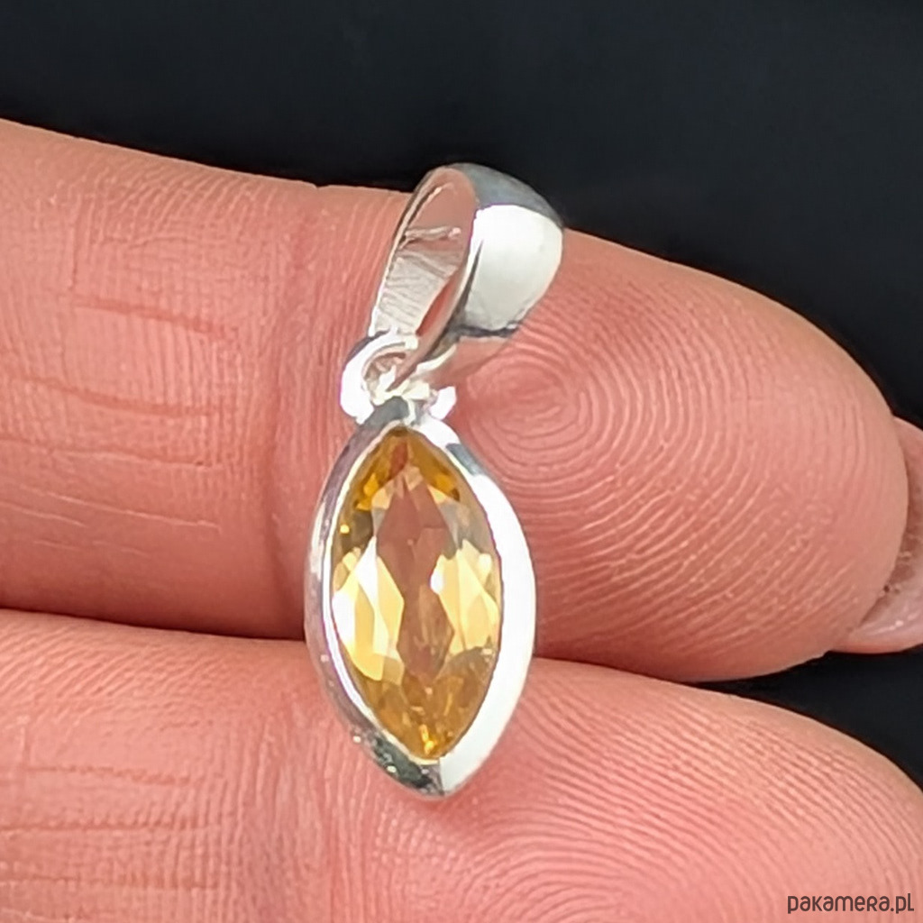 Subtelny cytryn w oprawie srebra próby 925. Wymiary 13 x 8 mm. Długość wisiorka 23 mm. Waga 2,49 grama. Polecam, uroczy drobiazg wykonany przez dostawcę kamieni.