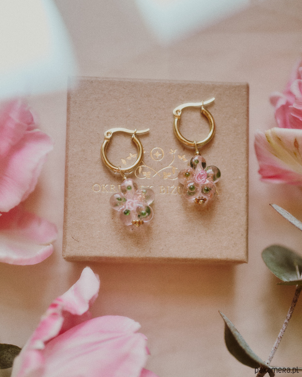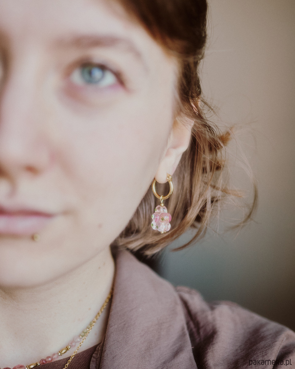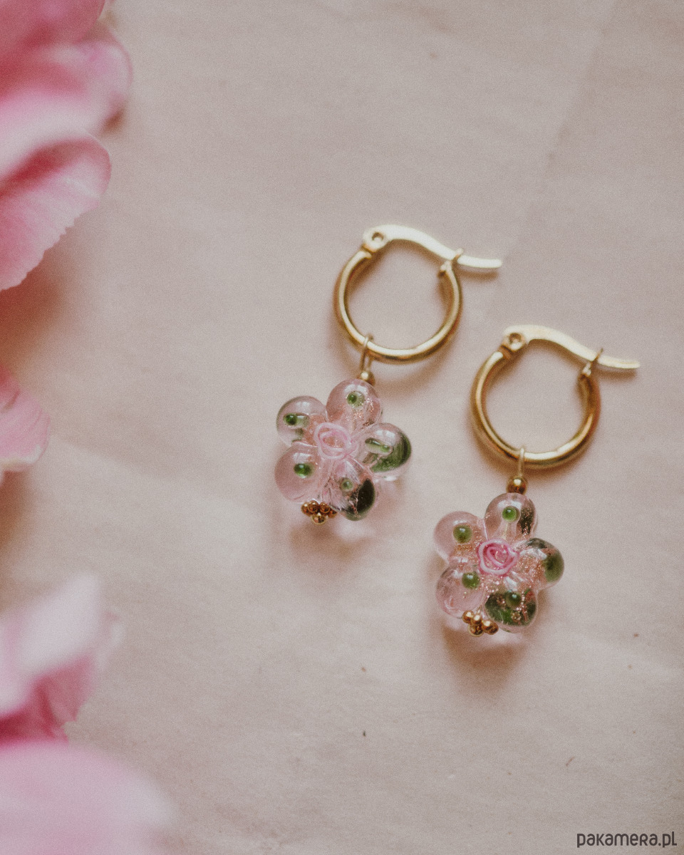 ᴍᴀʀʟᴇᴛᴋᴀ to szklane kwiaty w różowym odcieniu ze złotym pyłkiem wewnątrz i zielonymi kropeczkami. Zawieszone są na kółkach o średnicy 25 mm.