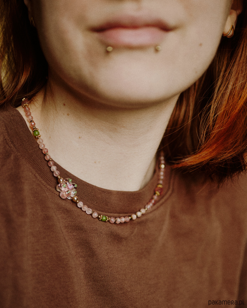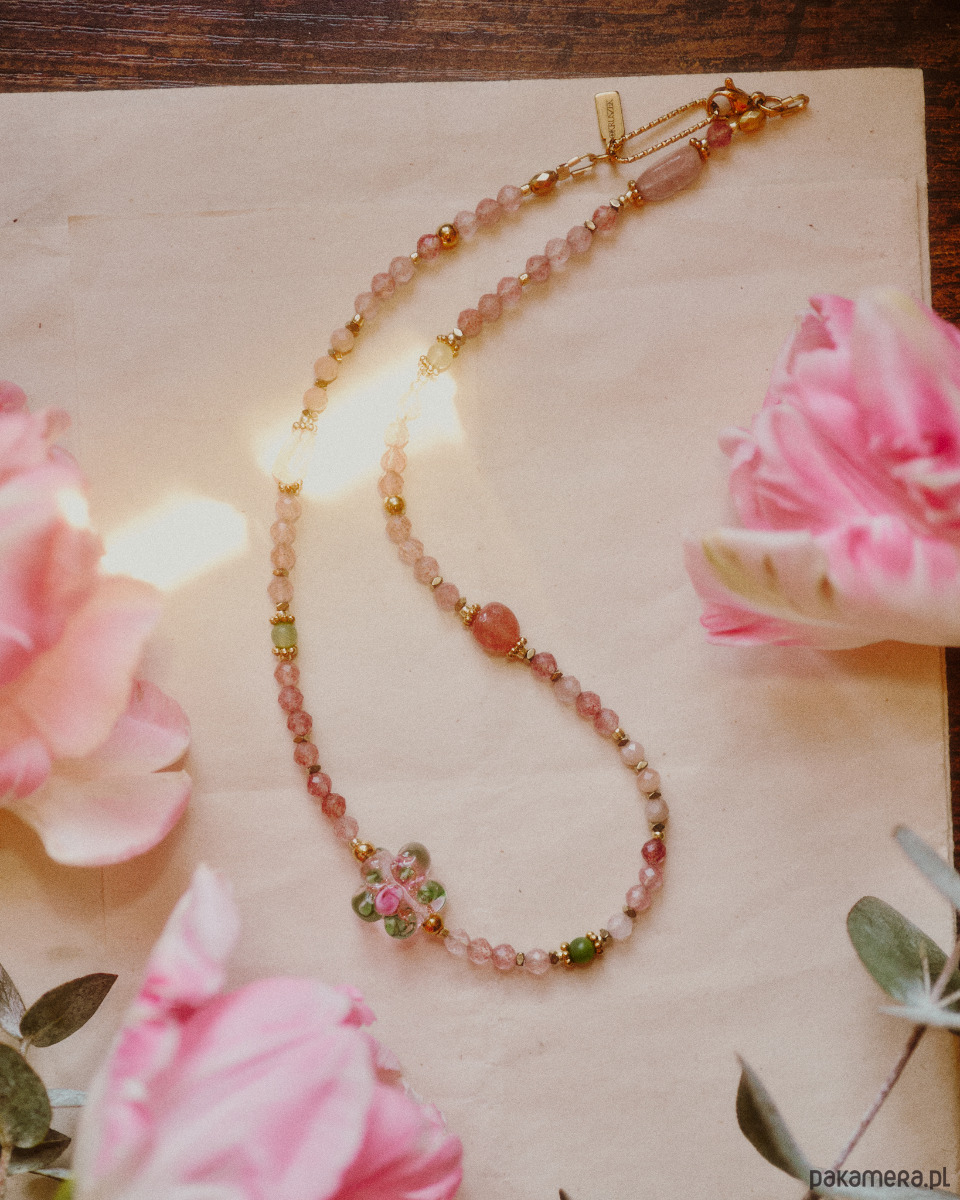 Marletka, naszyjnik z kwarcem truskawkowym i kwiatem