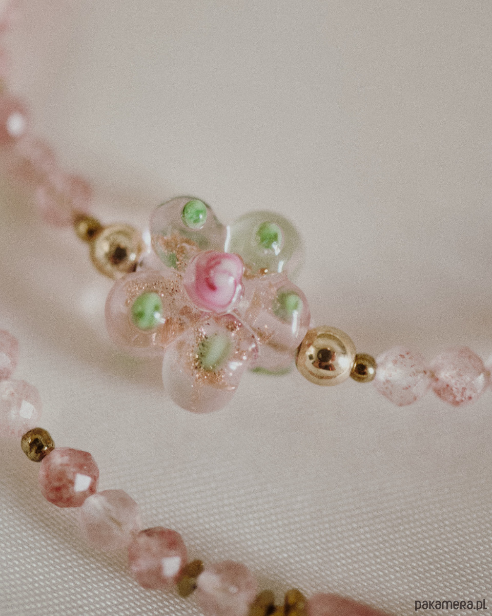 ᴍᴀʀʟᴇᴛᴋᴀ składa się z truskawkowego kwarcu różowego, kamienia słonecznego, zielonego agatu, hematytu oraz szklanego kwiatka w różowym odcieniu ze złotym pyłkiem wewnątrz. Wykończona stalą jubilerską, nie uczula. Długość 41 cm.