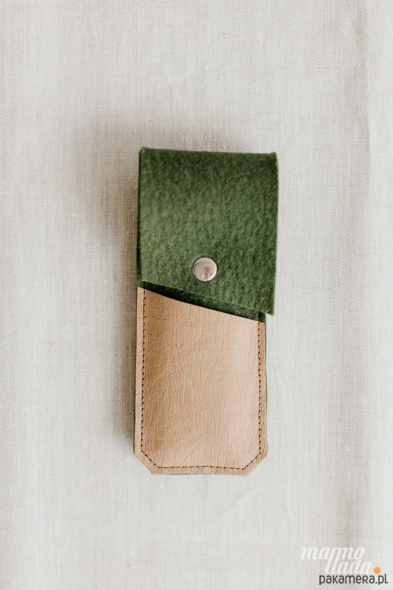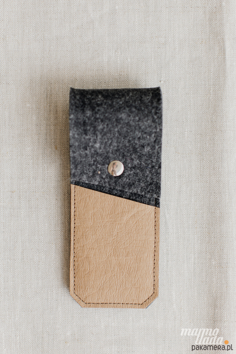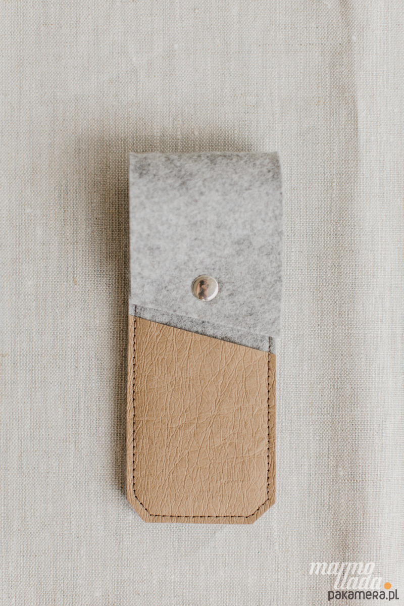 Minimalistyczne etui wykonane z grubego wełnianego filcu w kolorze szary melanż to elegancki pokrowiec do przechowywania długopisów, pióra lub ołówków. Etui posiada 1 kieszonkę z piaskowej washpapy na banknoty lub drobiazgi, jest zapinane na zatrzask.