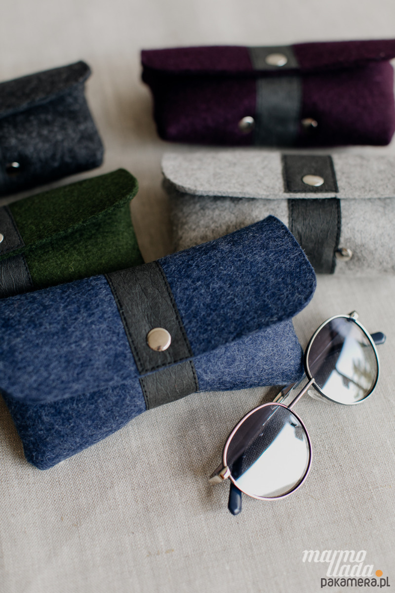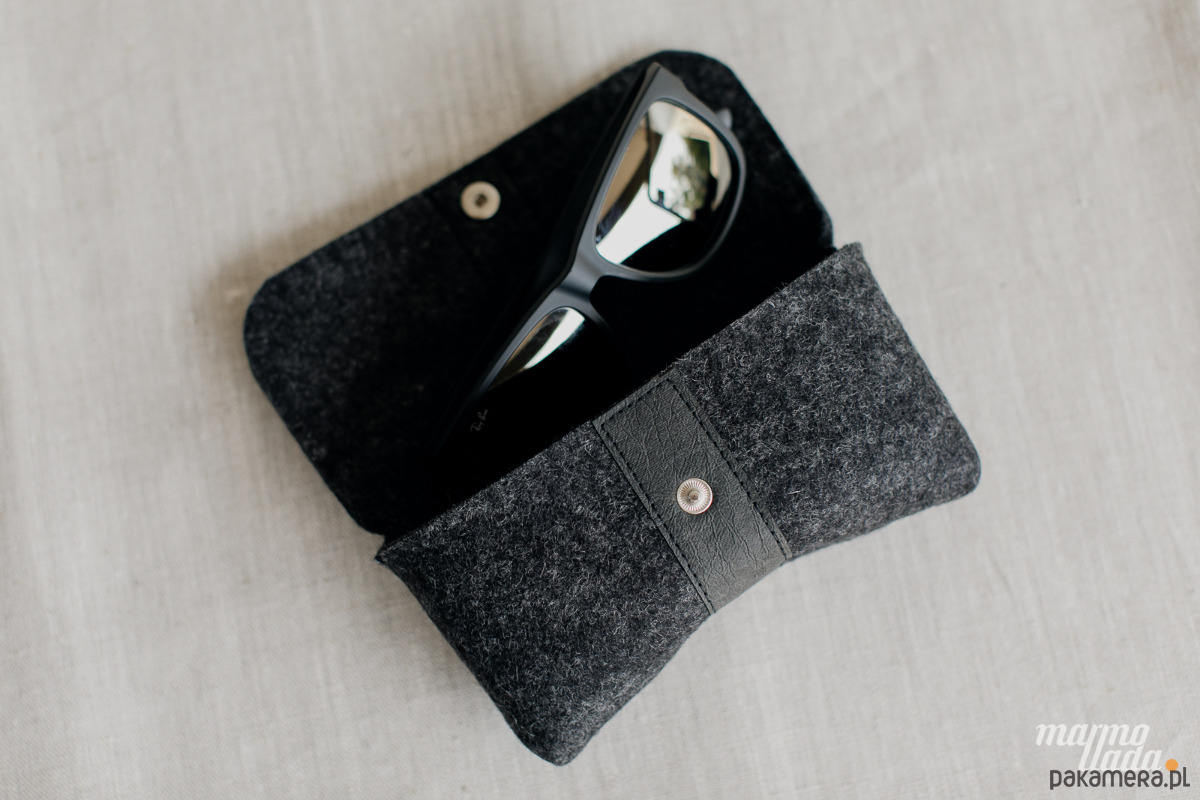 Zgrabne i minimalistyczne etui na okulary wykonane z grubego wełnianego filcu kolorze grafitowy melanż. Dekoracyjnym akcentem jest czarny pasek z washpapy przebiegający przez środek etui. Etui posiada zapięcie na zatrzask a wewnątrz wyprofilowany kształt na noski okularów.