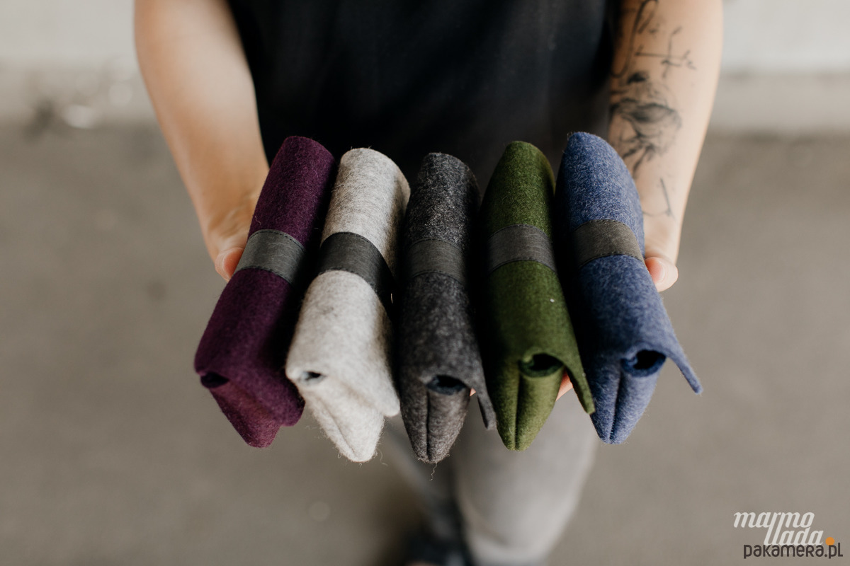 Zgrabne i minimalistyczne etui na okulary wykonane z grubego wełnianego filcu kolorze niebieskim. Dekoracyjnym akcentem jest czarny pasek z washpapy przebiegający przez środek etui. Etui posiada zapięcie na zatrzask a wewnątrz wyprofilowany kształt na noski okularów.