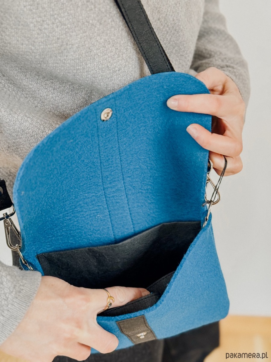Klasyczna torebka listonoszka uszyta z grubego wełnianego filcu z wewnętrzną kieszenią z washpapy.
