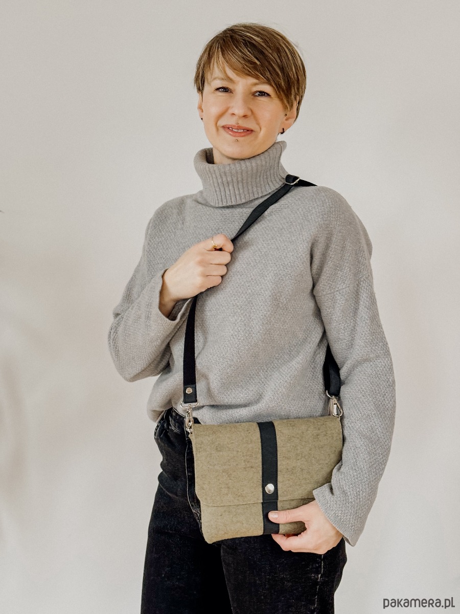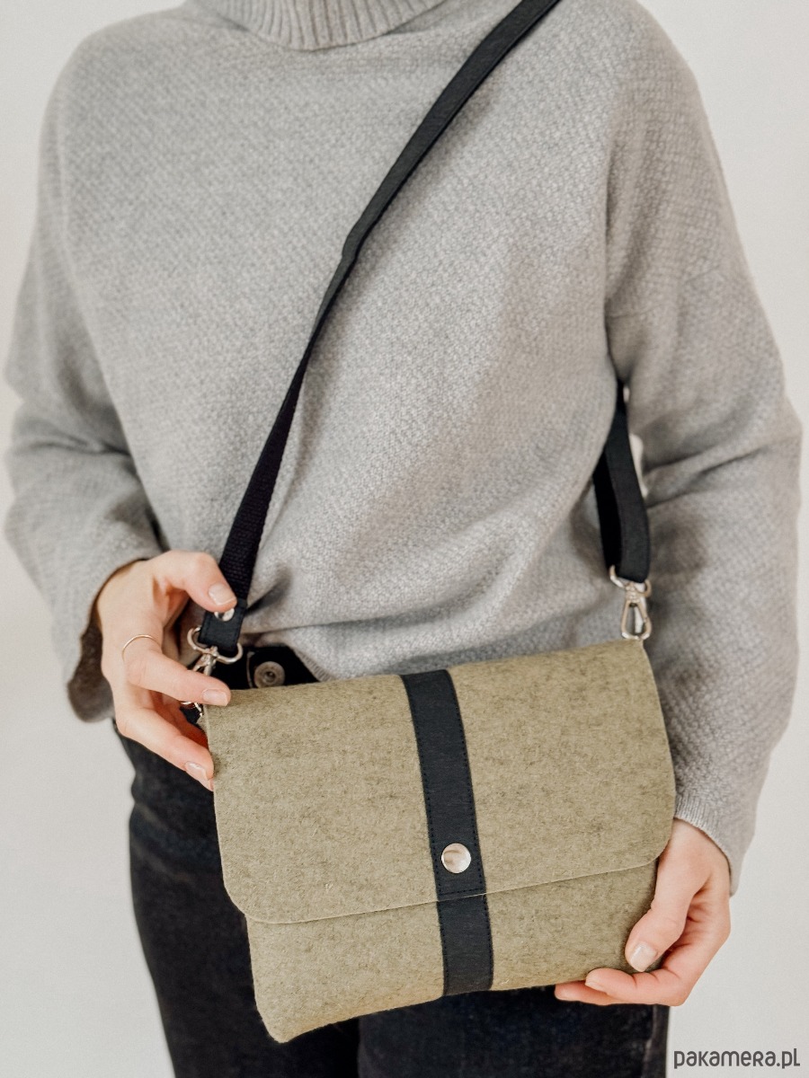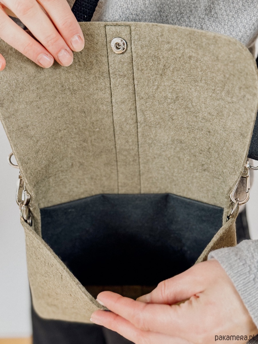 Klasyczna torebka listonoszka uszyta z grubego wełnianego filcu z wewnętrzną kieszenią z washpapy.