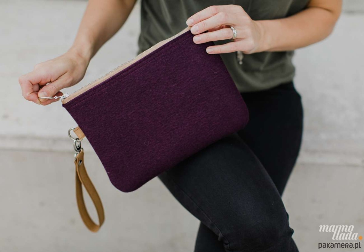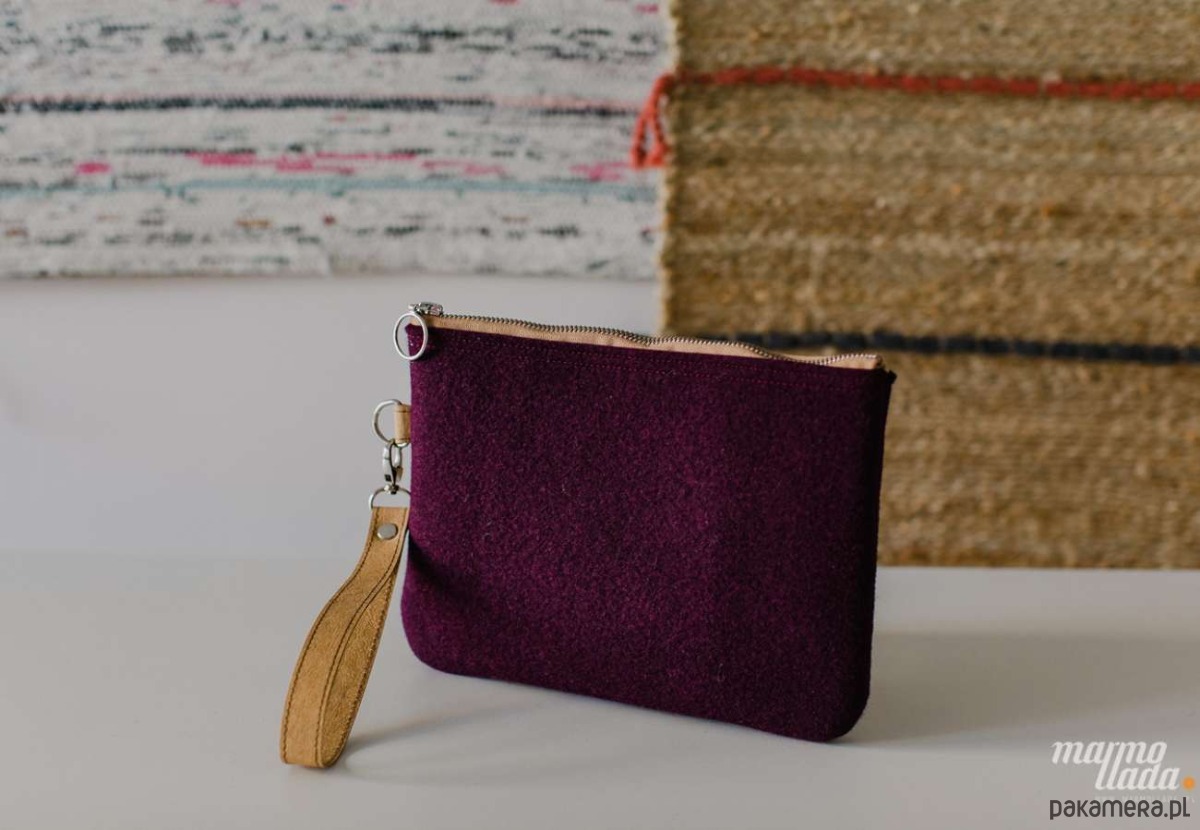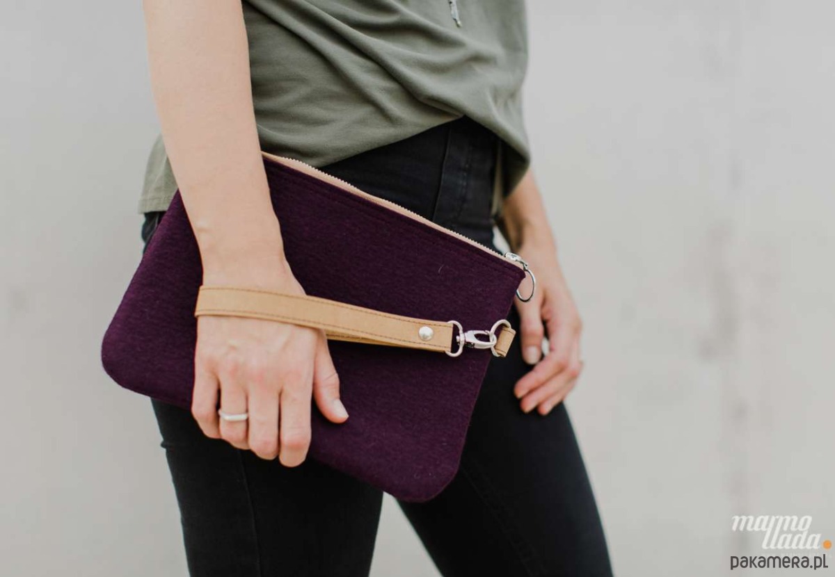 Duża kopertówka wykonana z grubego wełnianego filcu doskonałej jakości. Kopertówka w kolorze oberżyny jest zapinana za pomocą metalowego zamka, wewnątrz jest wykończona bawełnianą brązową podszewką w małe kropki, z dwiema wsuwanymi kieszonkami. Kopertówka ma pasek z impregnowanego papieru w kolorze piaskowym umożliwiający noszenie jej w ręce lub na nadgarstku.