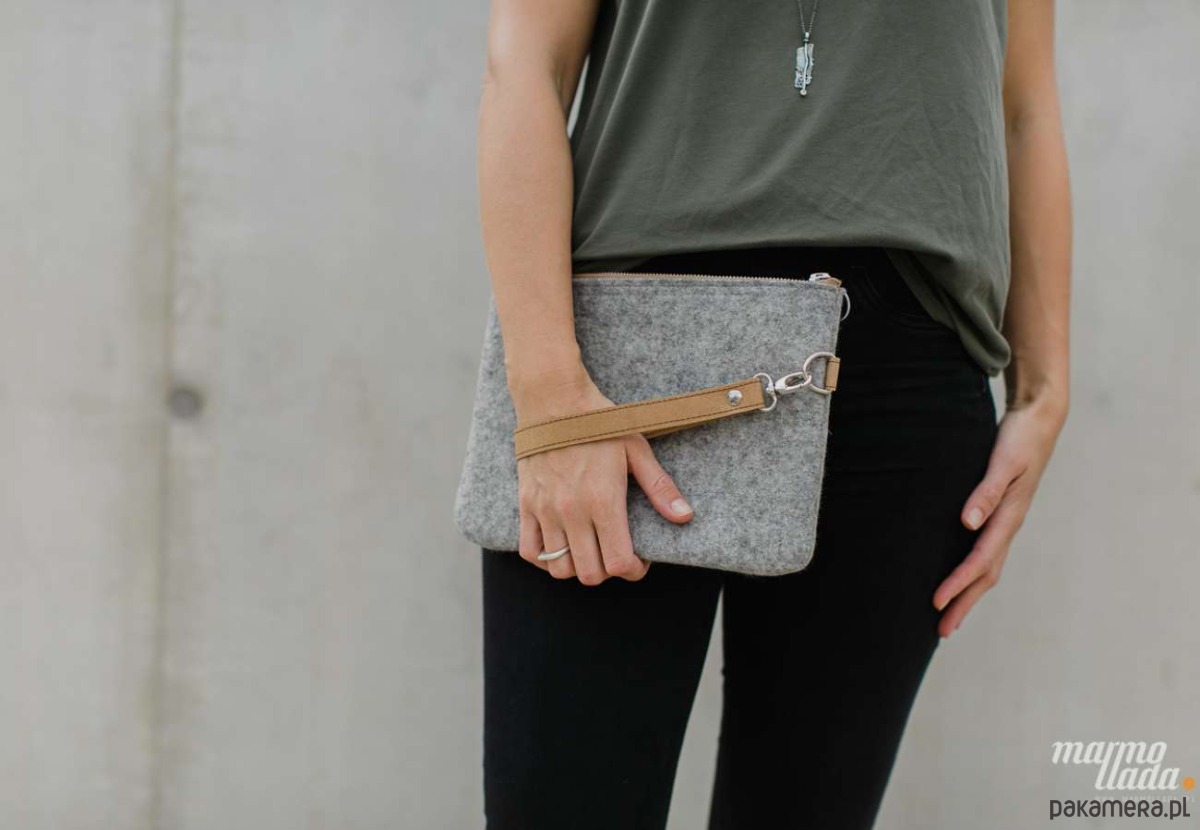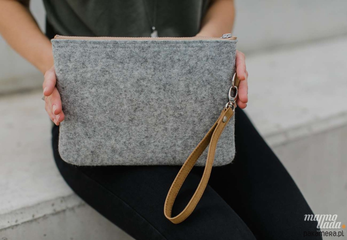 Duża kopertówka wykonana z grubego wełnianego filcu doskonałej jakości. Kopertówka w klasycznym kolorze szarym jest zapinana za pomocą metalowego zamka, wewnątrz jest wykończona bawełnianą brązową podszewką w duże kropki, z dwiema wsuwanymi kieszonkami. Kopertówka ma pasek z impregnowanego papieru w kolorze piaskowym umożliwiający noszenie jej w ręce lub na nadgarstku.