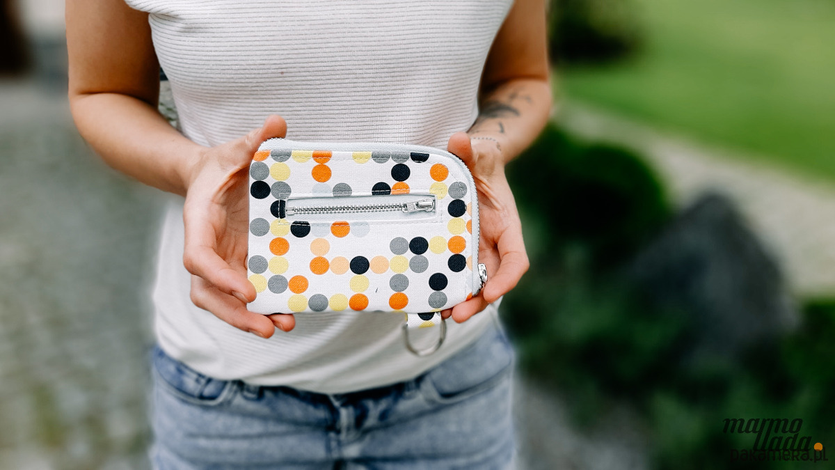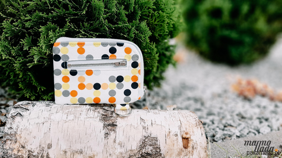Niewielki portfel o prostokątnym kształcie, uszyty z grubej bawełny w kolorowe, jesienne kropki, zapinany na metalowy zamek w kolorze błękitnym. Na zewnątrz ma kieszonkę na monety zapinaną na metalowy zamek. Wewnątrz znajduje się mocna, bawełniana podszewka w kolorze błękitnym oraz kieszonka na karty i dokumenty. Portfel pomieści również dowód rejestracyjny samochodu oraz banknoty. Posiada metalowe półkółko, dzięki czemu można go przypiąć do karabińczyka, który znajduje się w każdej torebce. Portfel można prać w pralce.