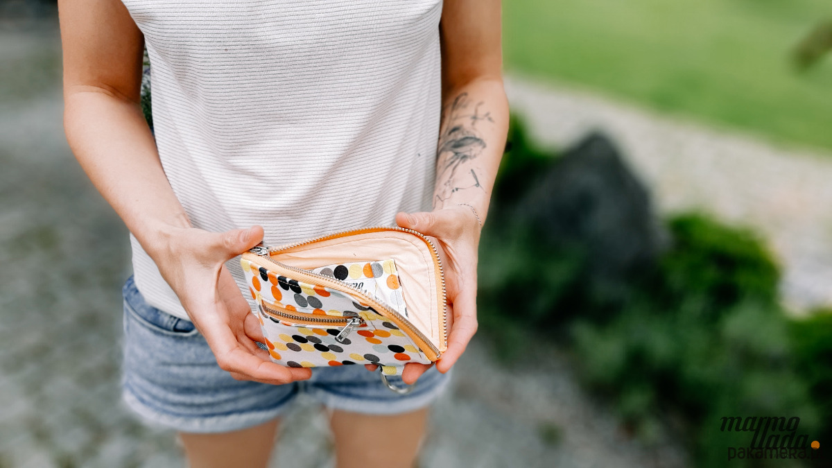 Niewielki portfel o prostokątnym kształcie, uszyty z grubej bawełny w kolorowe, jesienne kropki, zapinany na metalowy zamek w kolorze pomarańczowym. Na zewnątrz ma kieszonkę na monety zapinaną na metalowy zamek. Wewnątrz znajduje się mocna, bawełniana podszewka w kolorze pomarańczowym oraz kieszonka na karty i dokumenty. Portfel pomieści również dowód rejestracyjny samochodu oraz banknoty. Posiada metalowe półkółko, dzięki czemu można go przypiąć do karabińczyka, który znajduje się w każdej torebce. Portfel można prać w pralce.