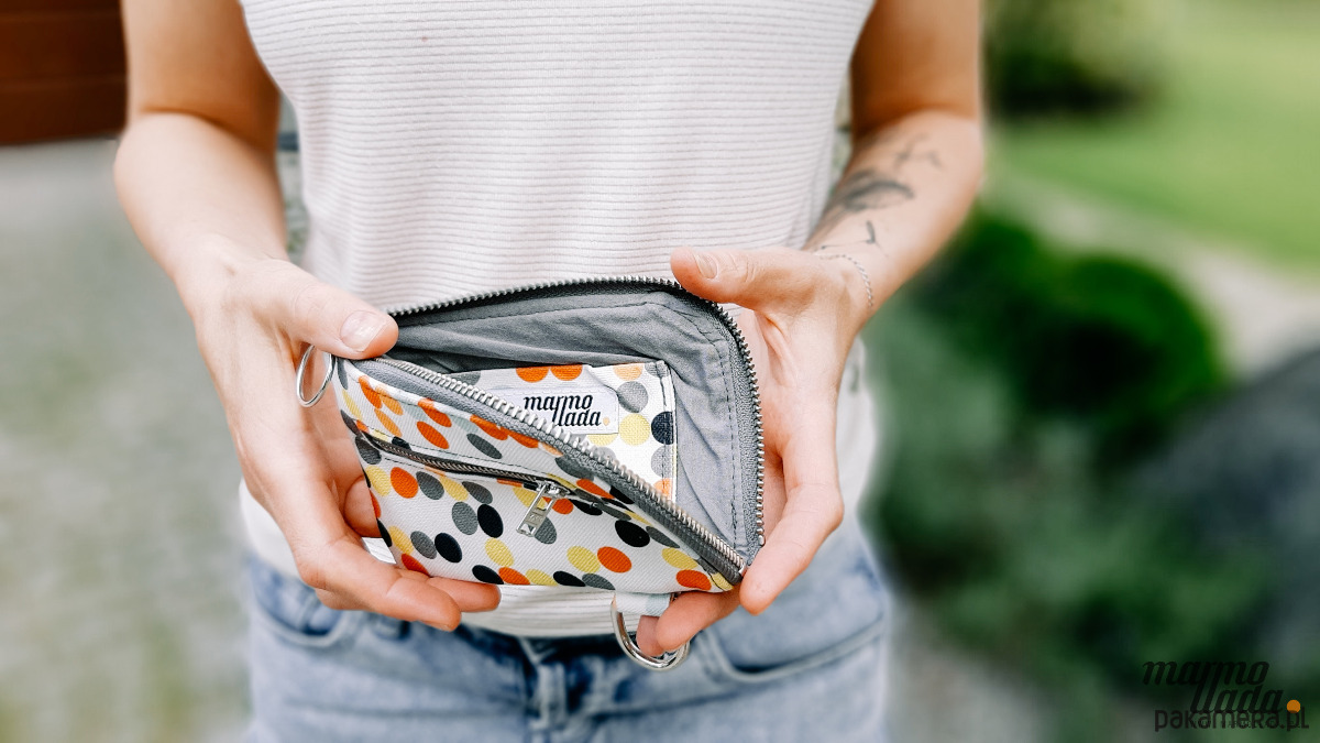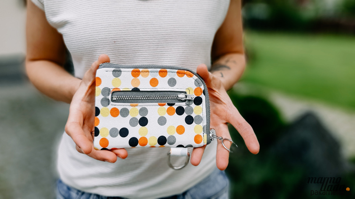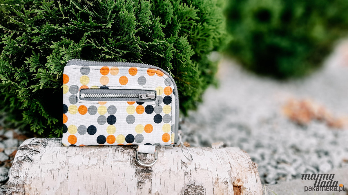 Niewielki portfel o prostokątnym kształcie, uszyty z grubej bawełny w kolorowe, jesienne kropki, zapinany na metalowy zamek w kolorze szarym . Na zewnątrz ma kieszonkę na monety zapinaną na metalowy zamek. Wewnątrz znajduje się mocna, bawełniana podszewka w kolorze szarym oraz kieszonka na karty i dokumenty. Portfel pomieści również dowód rejestracyjny samochodu oraz banknoty. Posiada metalowe półkółko, dzięki czemu można go przypiąć do karabińczyka, który znajduje się w każdej torebce. Portfel można prać w pralce.