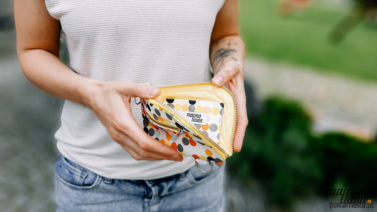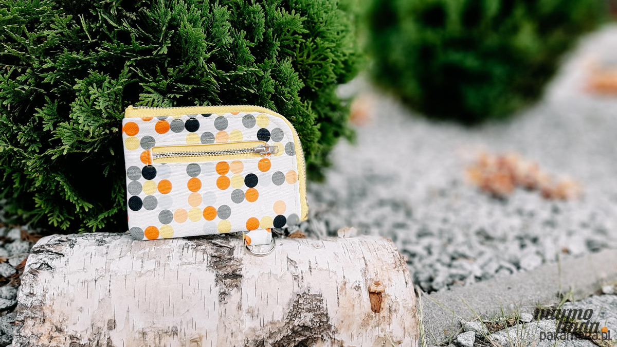 Niewielki portfel o prostokątnym kształcie, uszyty z grubej bawełny w kolorowe, jesienne kropki, zapinany na metalowy zamek w kolorze żółtym. Na zewnątrz ma kieszonkę na monety zapinaną na metalowy zamek. Wewnątrz znajduje się mocna, bawełniana podszewka w kolorze żóltym oraz kieszonka na karty i dokumenty. Portfel pomieści również dowód rejestracyjny samochodu oraz banknoty. Posiada metalowe półkółko, dzięki czemu można go przypiąć do karabińczyka, który znajduje się w każdej torebce. Portfel można prać w pralce.