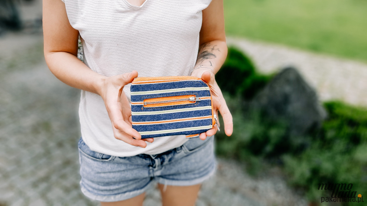 Portfel z jeansu w paski z pomarańczowym zamkiem