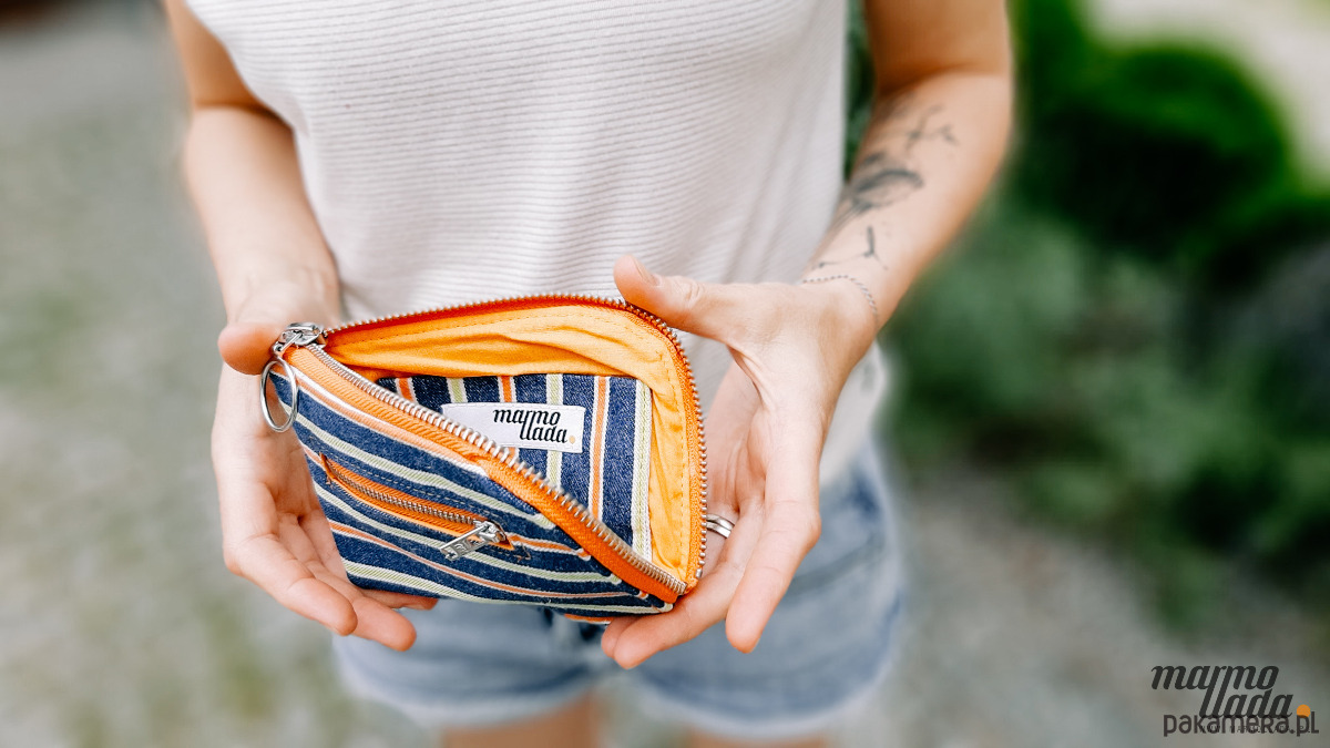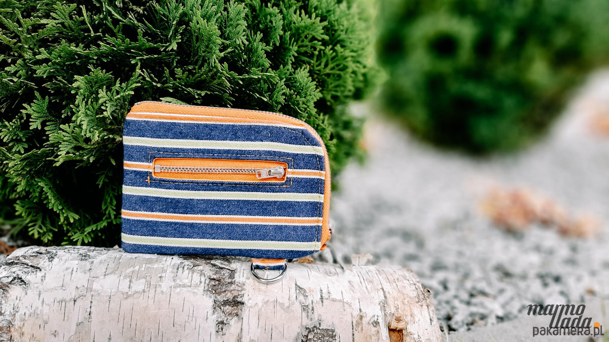 Niewielki portfel o prostokątnym kształcie, uszyty z grubego jeansu w kolorowe paski, zapinany na metalowy zamek. Na zewnątrz ma kieszonkę na monety zapinaną na metalowy zamek. Wewnątrz znajduje się mocna, bawełniana pomarańczowa podszewka z kieszonką na karty i dokumenty. Portfel pomieści również dowód rejestracyjny samochodu oraz banknoty. Posiada metalowe półkółko, dzięki czemu można go przypiąć do karabińczyka, który znajduje się w każdej torebce. Portfel można prać w pralce.