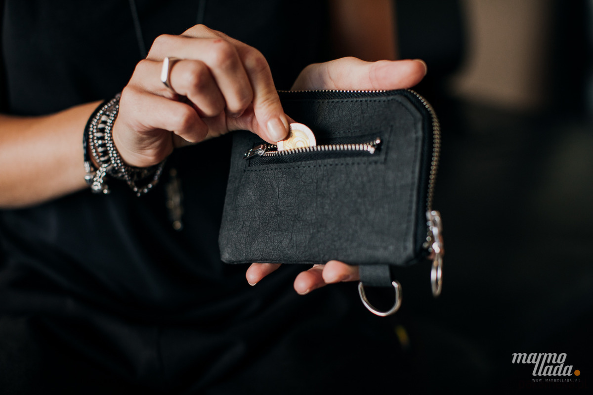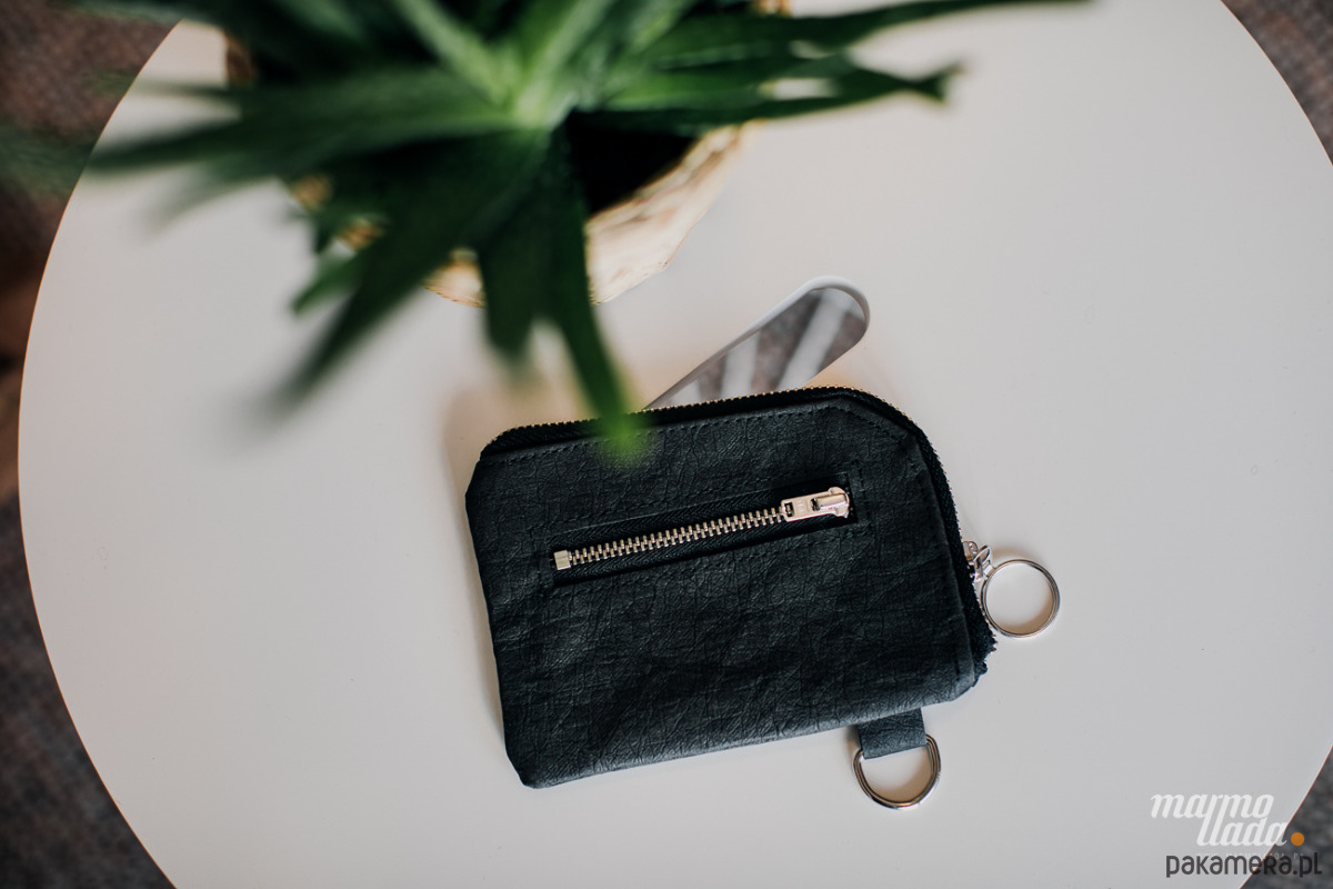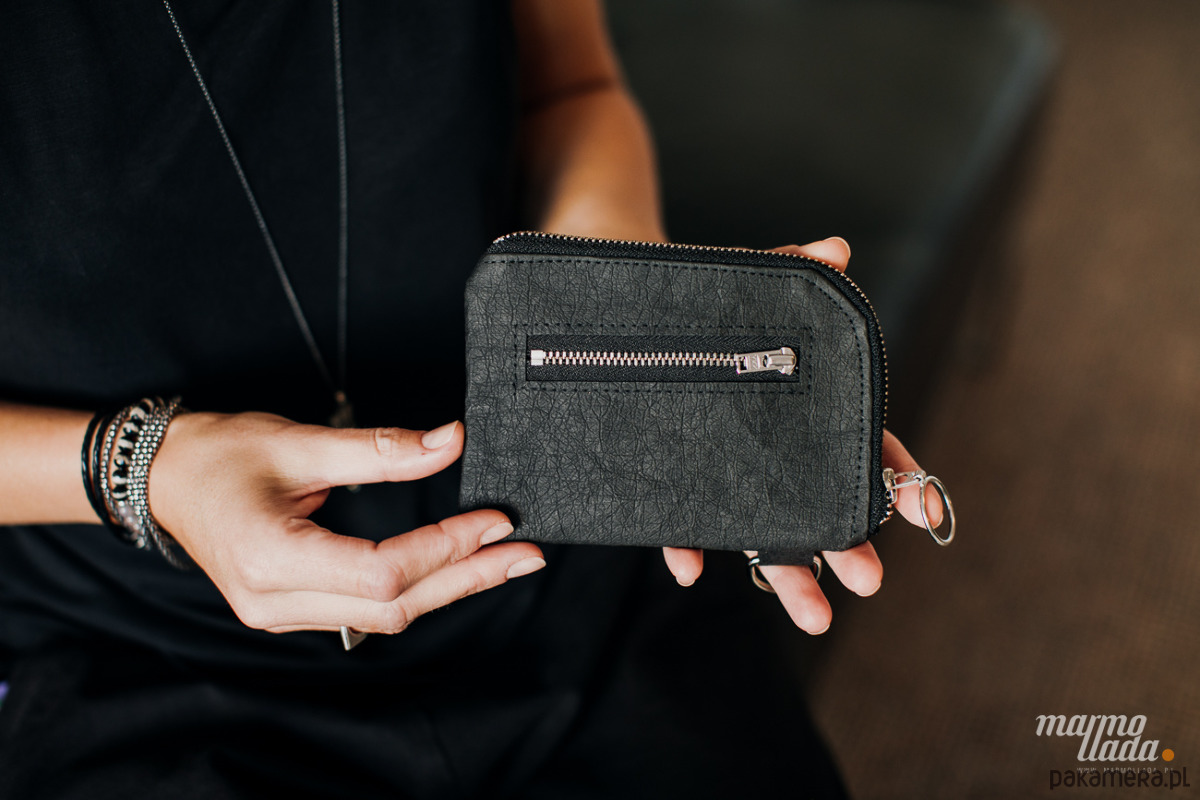 Mały portfel o prostokątnym kształcie, wykonany z impregnowanego papieru w kolorze czarnym. Posiada zewnętrzną kieszonkę na monety, zapinaną na metalowy zamek. Wewnątrz znajduje się bawełniana podszewka oraz kieszonka na karty i dokumenty. Portfel pomieści również dowód rejestracyjny samochodu oraz banknoty. Posiada metalowe półkółko, dzięki czemu można go przypiąć do karabińczyka, który znajduje się w każdej torebce. Portfel jest zapinany na metalowy zamek z wygodnym uchwytem.