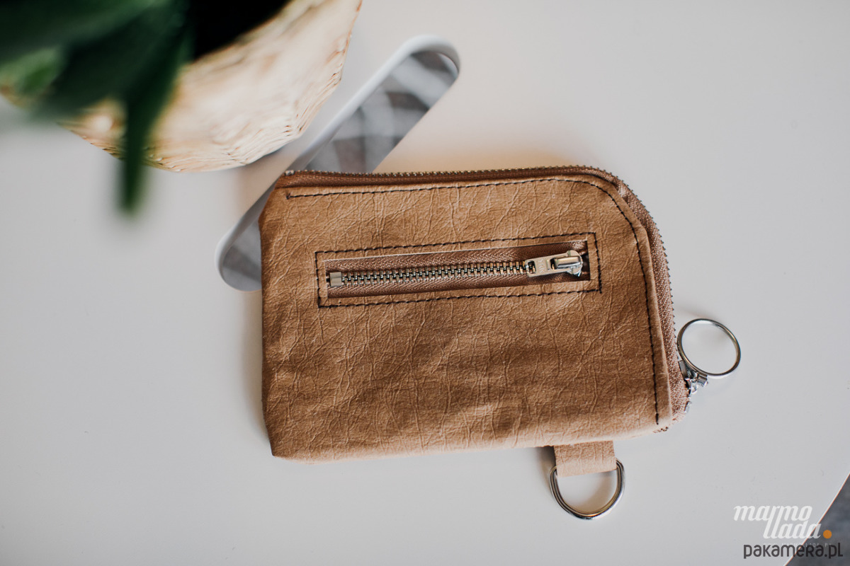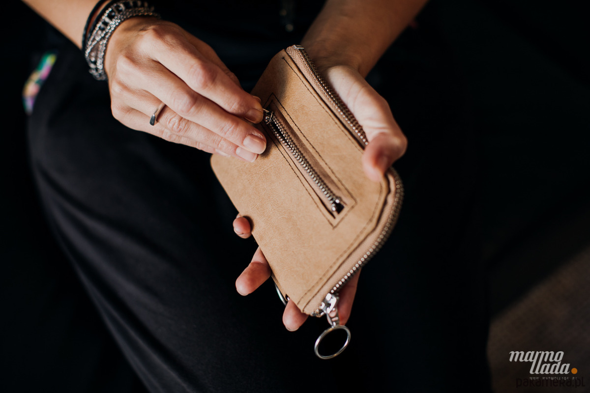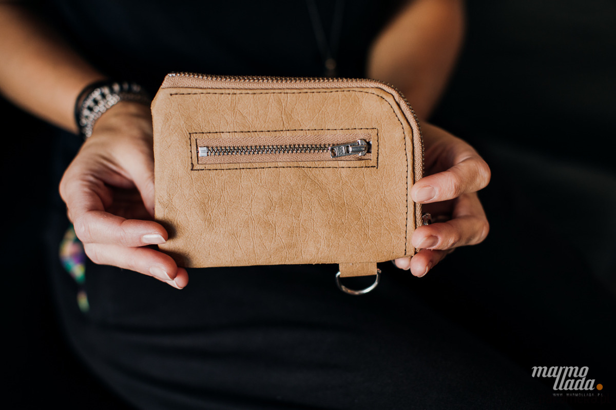 Mały portfel o prostokątnym kształcie, wykonany z impregnowanego papieru w kolorze piaskowym. Posiada zewnętrzną kieszonkę na monety, zapinaną na metalowy zamek. Wewnątrz znajduje się bawełniana podszewka w małe białe kropki oraz kieszonka na karty i dokumenty. Portfel pomieści również dowód rejestracyjny samochodu oraz banknoty. Posiada metalowe półkółko, dzięki czemu można go przypiąć do karabińczyka, który znajduje się w każdej torebce. Portfel jest zapinany na metalowy zamek z wygodnym uchwytem.