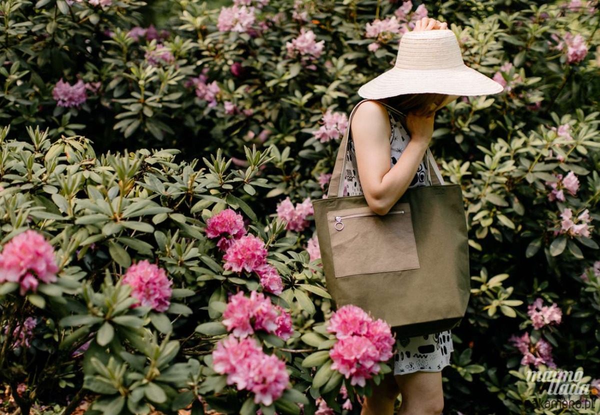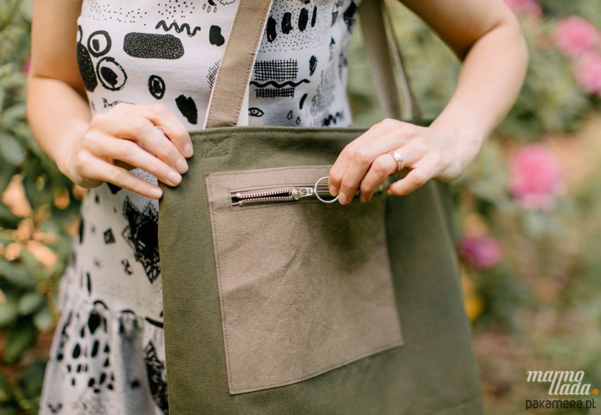 Pojemna torba na ramię uszyta z grubej bawełny w kolorze zielonym, zapinana na zamek. Na zewnątrz jest kieszonka z zielonego papieru zapinana na metalowy zamek, która pomieści klucze i telefon. Środek torby jest wykończony bawełnianą brązową podszewką w drobne białe kropki, posiada pasek zakończony karabińczykiem do przypięcia kluczy lub portfela oraz kieszonkę zapinaną na metalowy zamek.