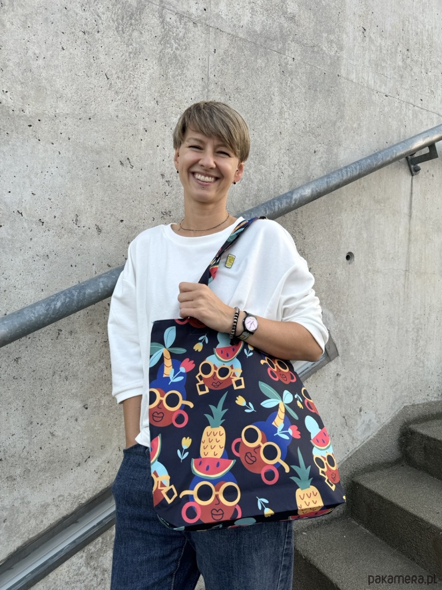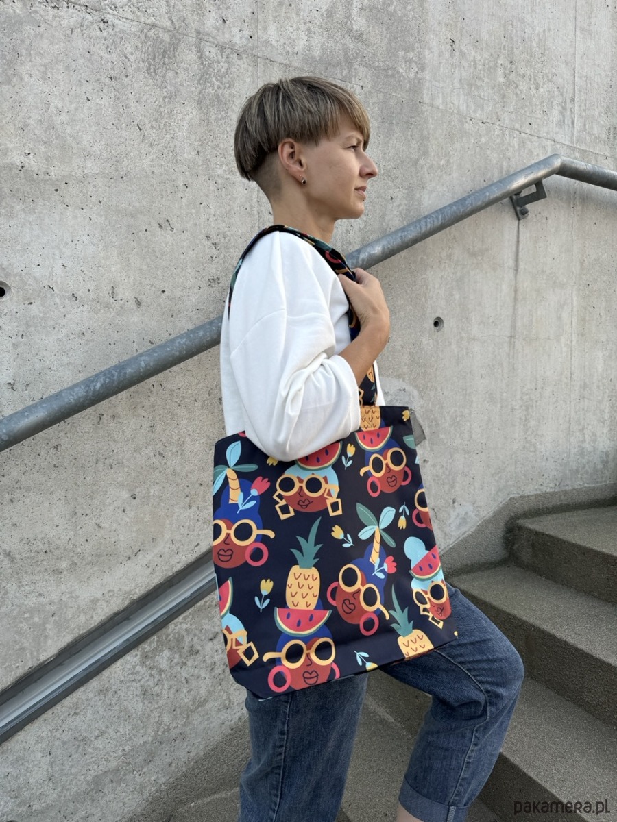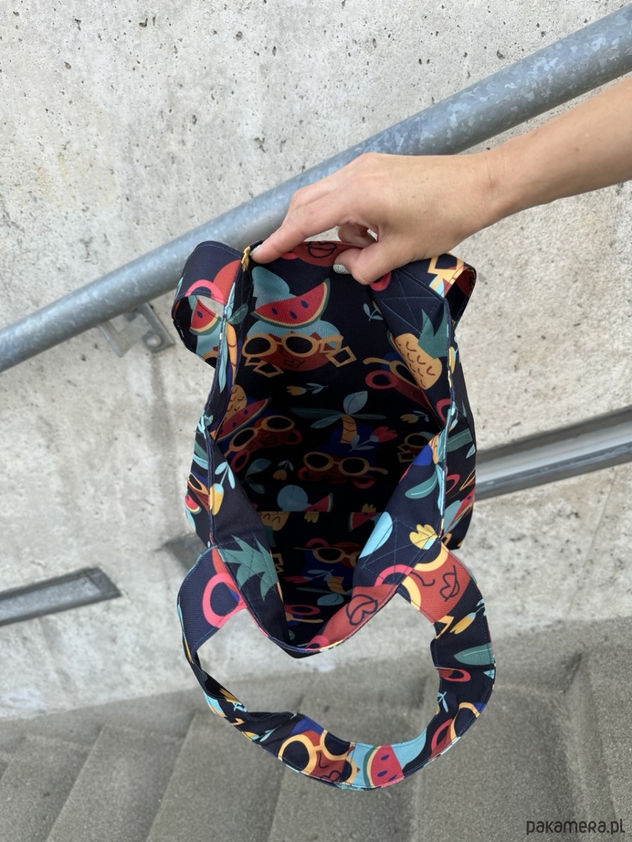 Torebka na ramię o prostokątnym kształcie, uszyta z tkaniny wodoodpornej w kolorowe owoce i twarze, wnętrze jest wykończone tym samym materiałem, torebka nie ma zamka ani kieszonek.