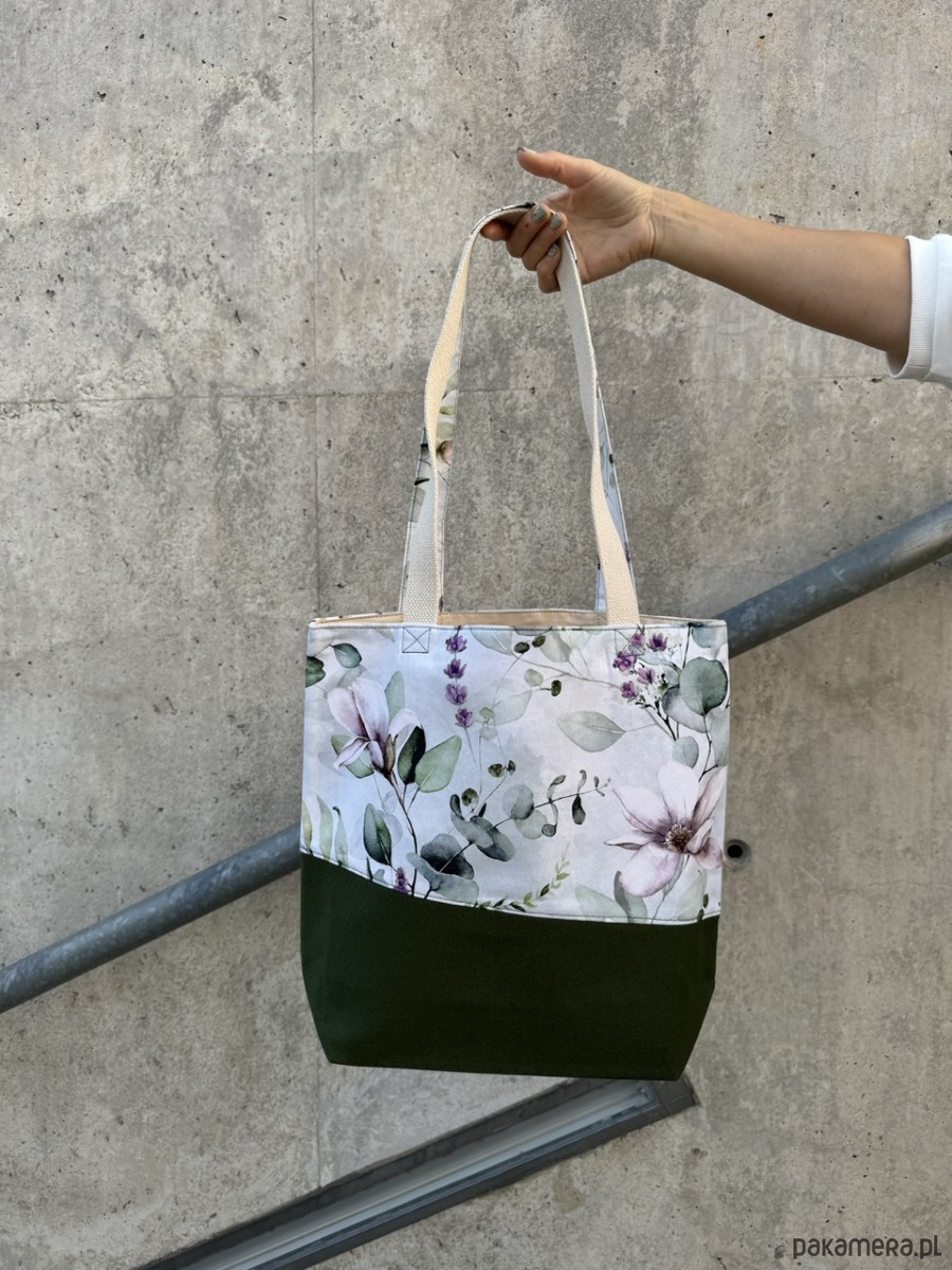 Torebka na ramię o prostokątnym kształcie, uszyta z tkaniny bawełnianej w zielonym kolorze z wzorzystym jasnym klinem. Wnętrze jest wykończone bawełnianą beżową podszewką, torebka jest zapinana na zamek, wewnątrz ma kieszonkę zapinaną na zamek.
