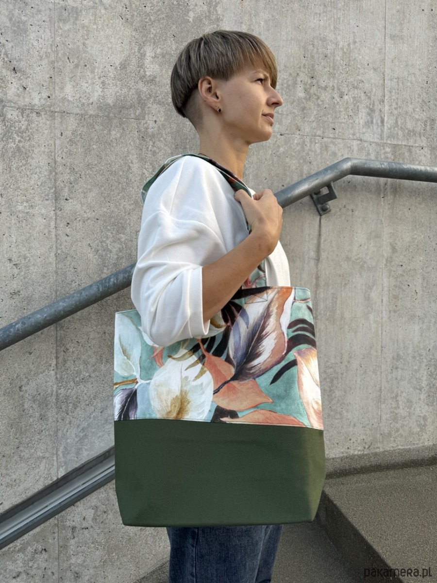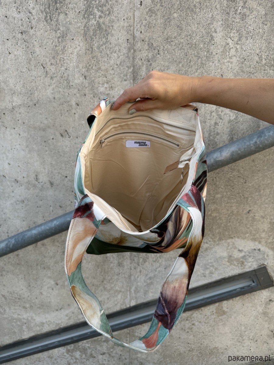 Torebka na ramię o prostokątnym kształcie, uszyta z tkaniny bawełnianej w zielonym kolorze z wzorzysto-liściastym klinem. Wnętrze jest wykończone bawełnianą beżową podszewką, torebka jest zapinana na zamek, wewnątrz ma kieszonkę zapinaną na zamek.