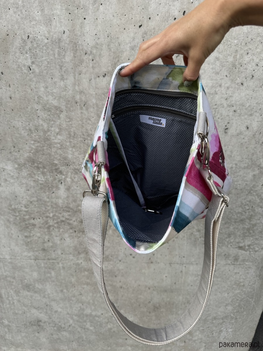 Torebka posiada regulowany pasek do noszenia torby na skos wykonany z impregnowanego papieru w kolorze szarym podszyty grubą taśmą bawełnianą w beżowym kolorze. Torebka posiada zapięcie na metalowy zamek. Optymalna wytrzymałość torebki to 2-3kg. Torebkę można prać w pralce.