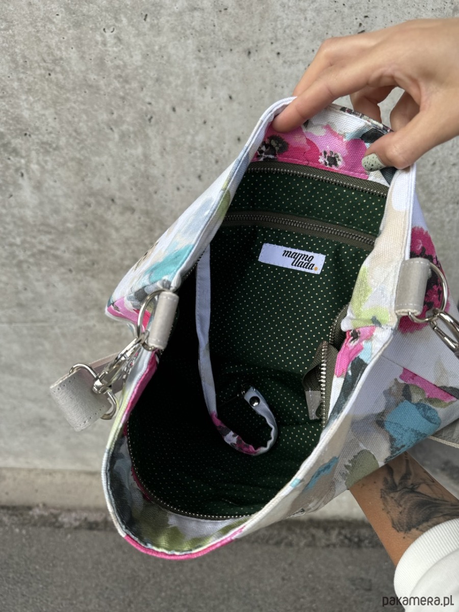 Torebka posiada regulowany pasek do noszenia torby na skos wykonany z impregnowanego papieru w kolorze szarym podszyty grubą taśmą bawełnianą w beżowym kolorze. Torebka posiada zapięcie na metalowy zamek. Optymalna wytrzymałość torebki to 2-3kg. Torebkę można prać w pralce.