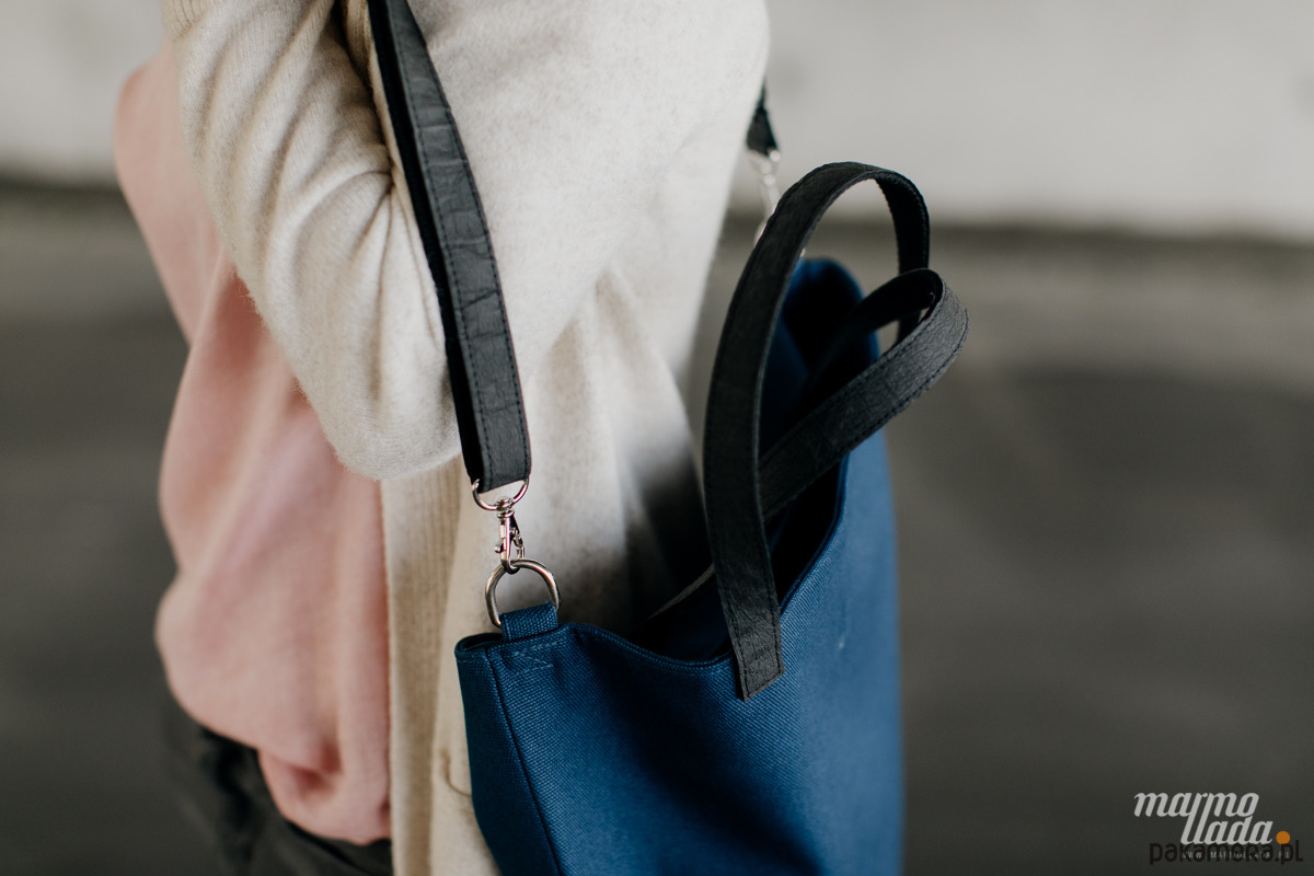 Elegancka i zgrabna torebka o półokrągłym kształcie, wykonana z grubej bawełny w kolorze granatowym. Wewnątrz znajduje się mocna, bawełniana podszewka w kropki, w niej kieszonka zapinana na metalowy zamek błyskawiczny oraz pasek zakończony karabińczykiem do przypięcia kluczy lub portfela.
