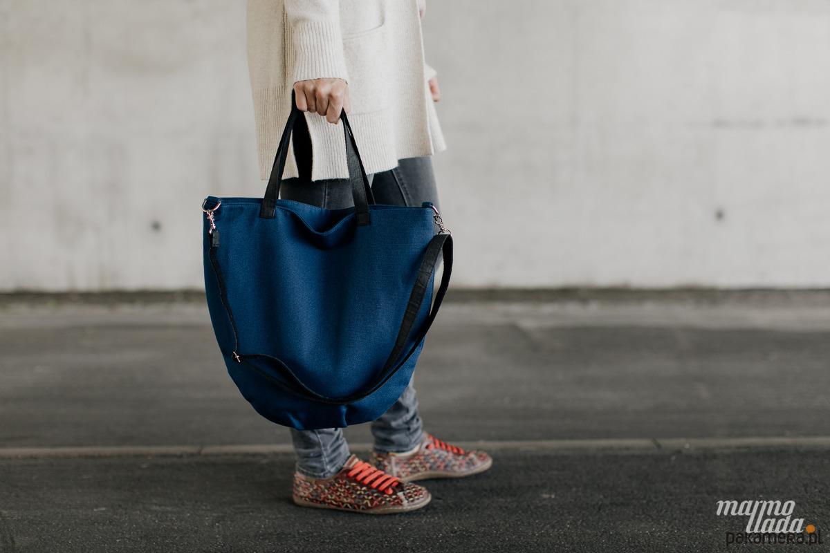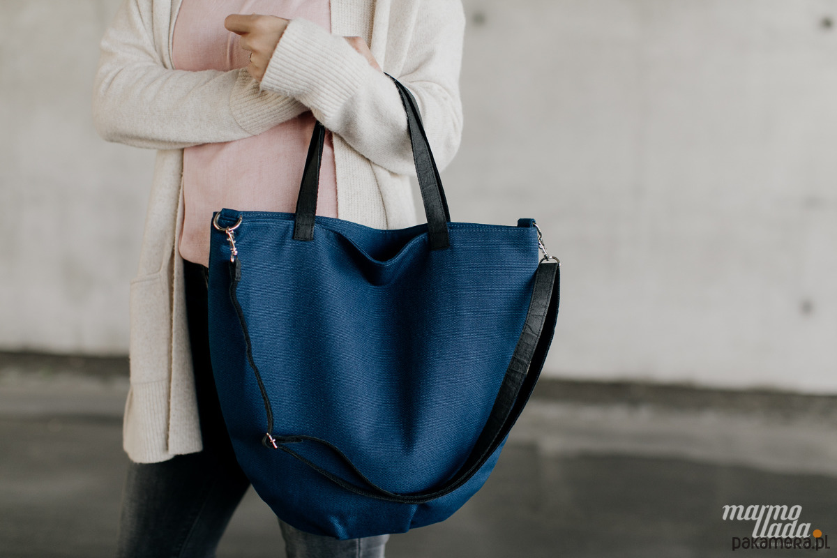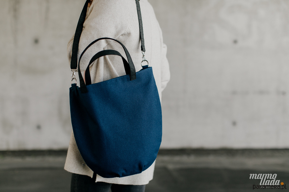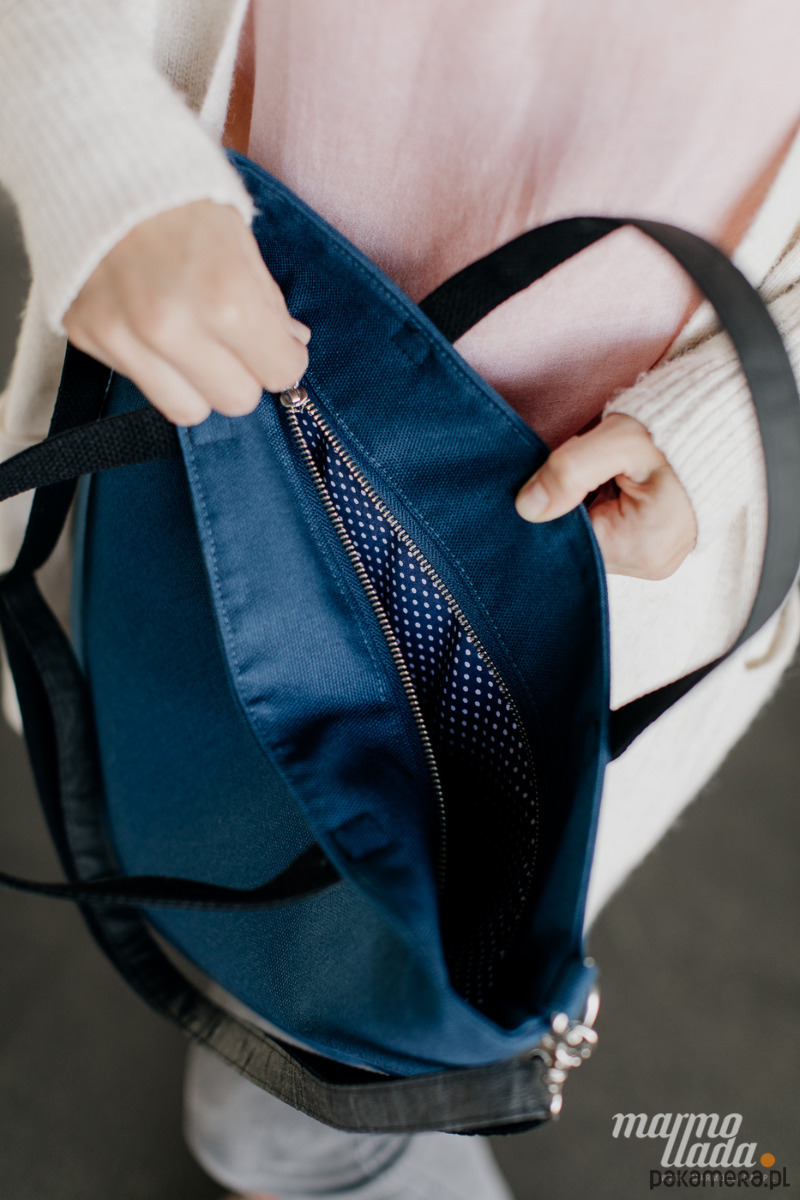 Elegancka i zgrabna torebka o półokrągłym kształcie, wykonana z grubej bawełny w kolorze granatowym. Wewnątrz znajduje się mocna, bawełniana podszewka w kropki, w niej kieszonka zapinana na metalowy zamek błyskawiczny oraz pasek zakończony karabińczykiem do przypięcia kluczy lub portfela.