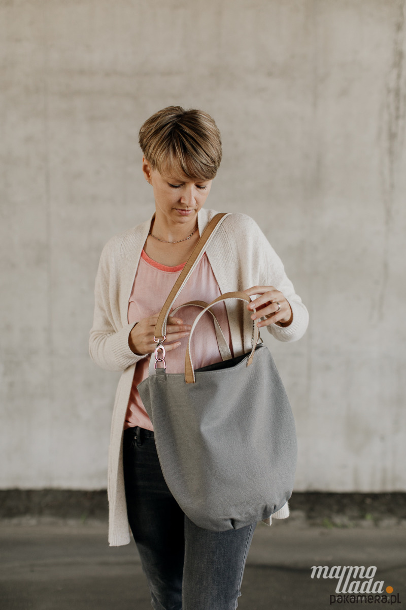 Elegancka i zgrabna torebka o półokrągłym kształcie, wykonana z grubej bawełny w kolorze szara. Wewnątrz znajduje się mocna, bawełniana podszewka w kropki, w niej kieszonka zapinana na metalowy zamek błyskawiczny oraz pasek zakończony karabińczykiem do przypięcia kluczy lub portfela.