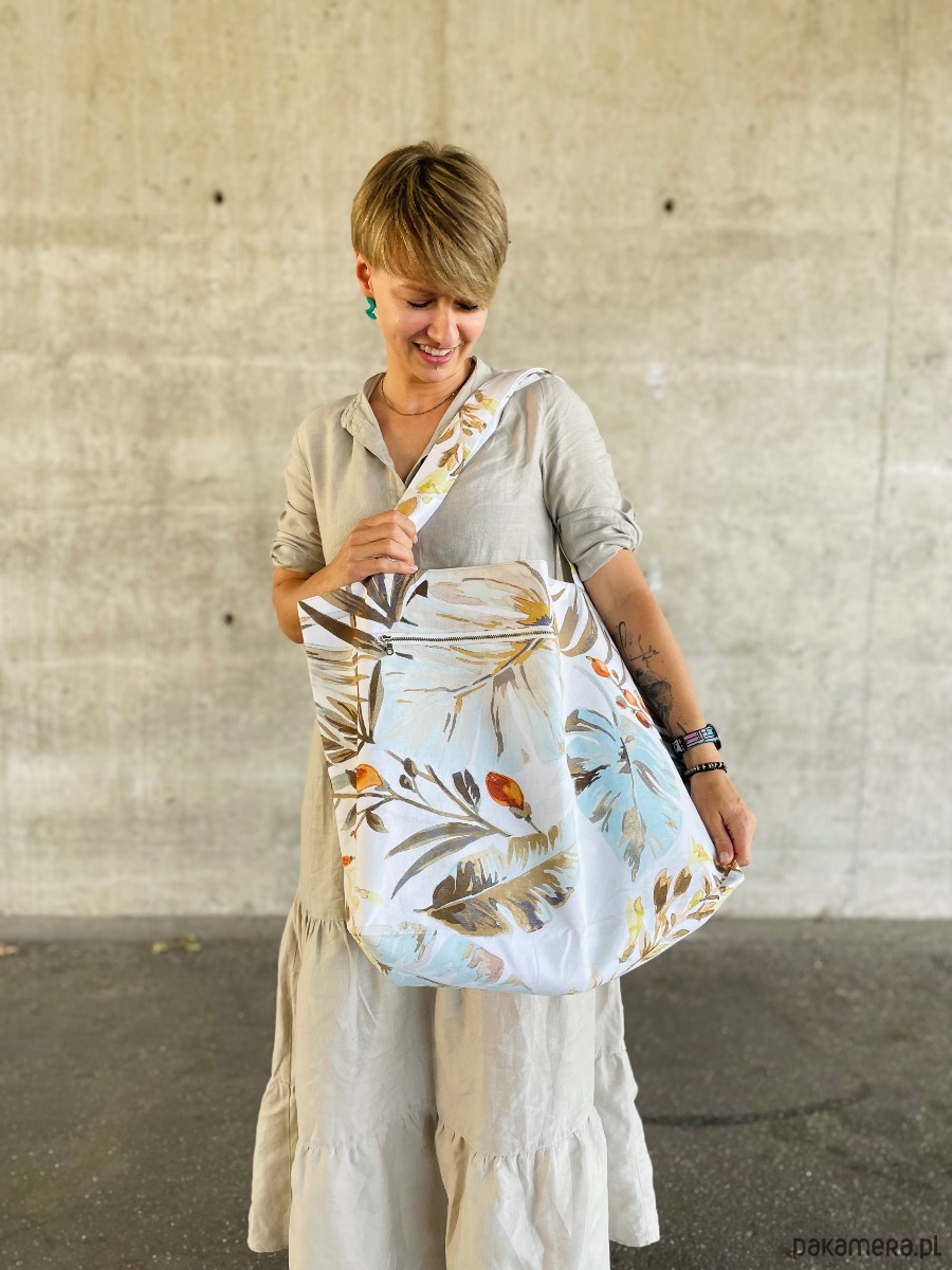 Torba o prostokątnym kształcie na ramię, uszyta z tkaniny bawełnianej w kolorowe wzory, podszewka bawełniana. Torebka ma na zewnątrz kieszonkę zapinaną na zamek, wewnątrz pasek zakończony karabińczykiem do przypięcia kluczy lub portfela.