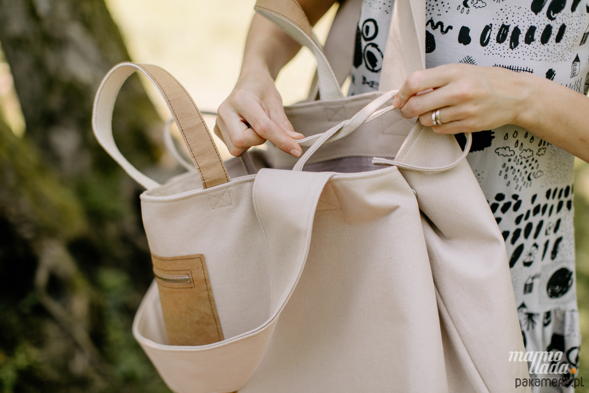 Wielka torba na ramię o prostokątnym kształcie, wykonana z mięsistej bawełny w kolorze beżowym zamykana na zawiązywane sznurki, na bokach torby znajdują się zatrzaski, które ją pomniejszają. Na zewnątrz jest kieszonka z piaskowego papieru zapinana na metalowy zamek.