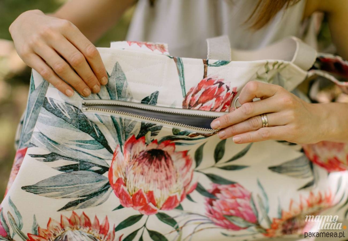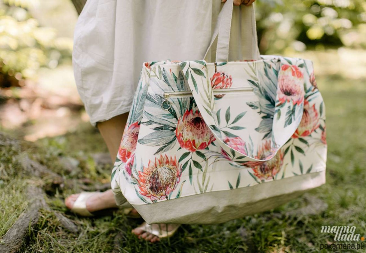 Wielka torba na ramię o prostokątnym kształcie, wykonana z grubej bawełny w kwiaty protea oraz z szarego impregnowanego papieru. Torba jest zamykana na zawiązywane sznurki, na bokach torby znajdują się zatrzaski, które ją pomniejszają. Na zewnątrz jest kieszonka zapinana na metalowy zamek.