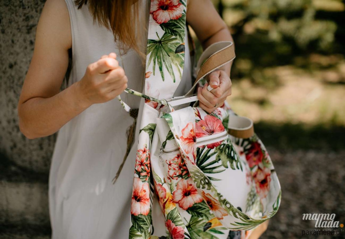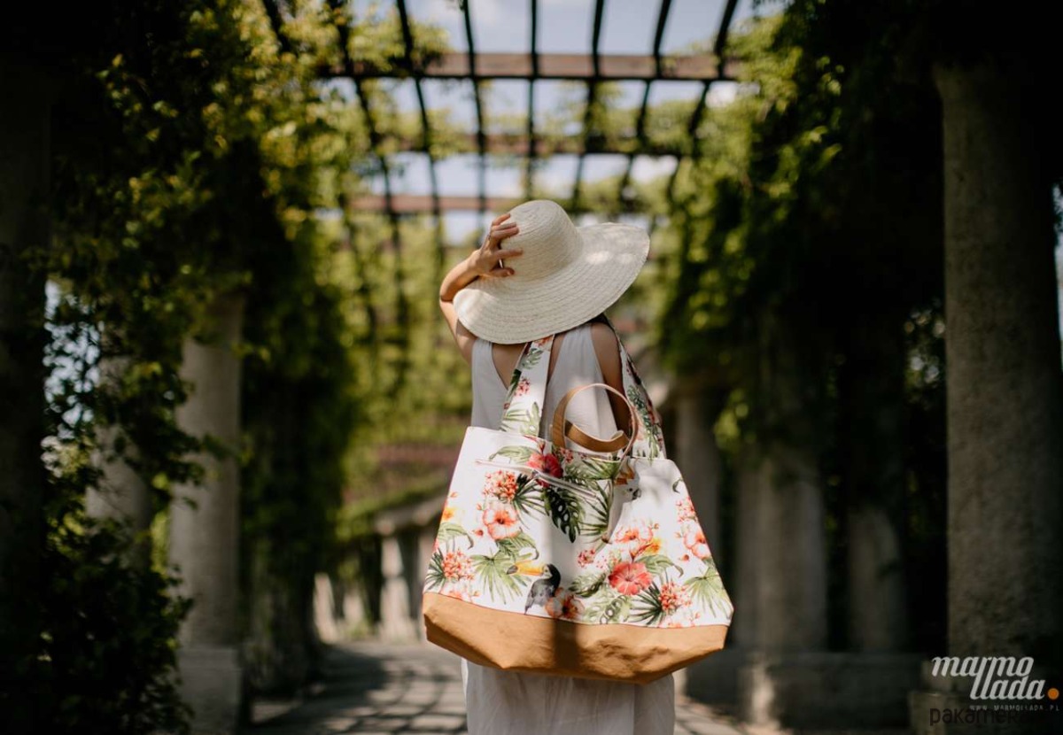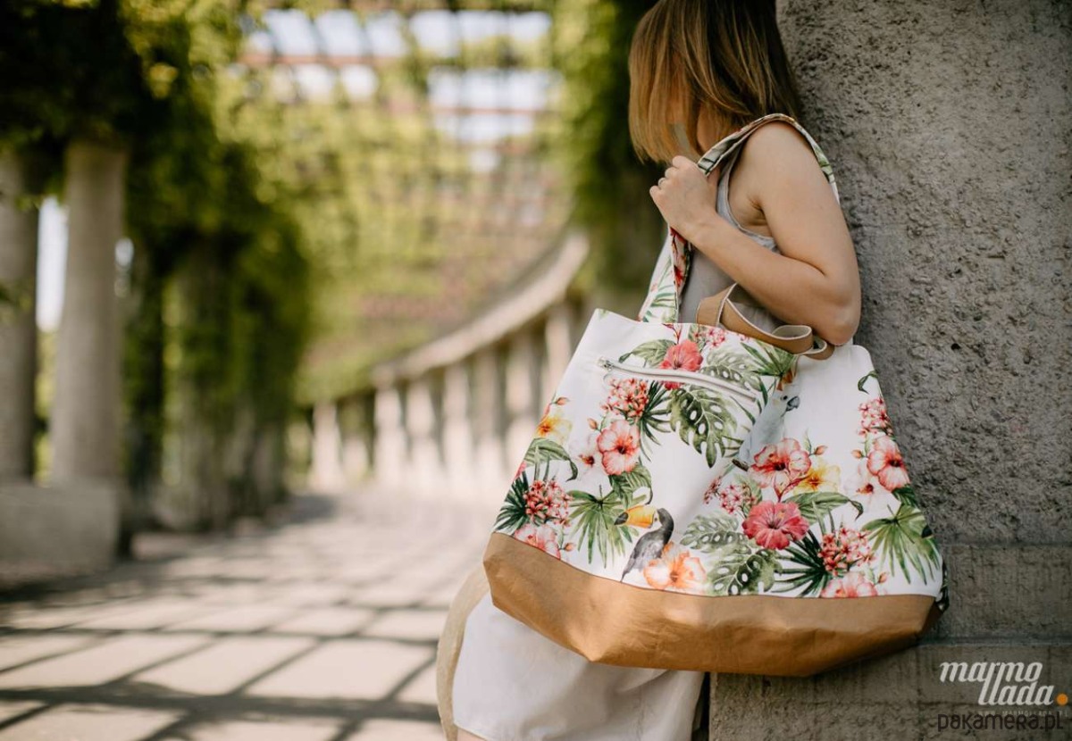 Wielka torba na ramię o prostokątnym kształcie, wykonana z grubej bawełny w tropikalne wzory oraz z piaskowego impregnowanego papieru. Torba jest zamykana na zawiązywane sznurki, na bokach torby znajdują się zatrzaski, które ją pomniejszają. Na zewnątrz jest kieszonka zapinana na metalowy zamek.