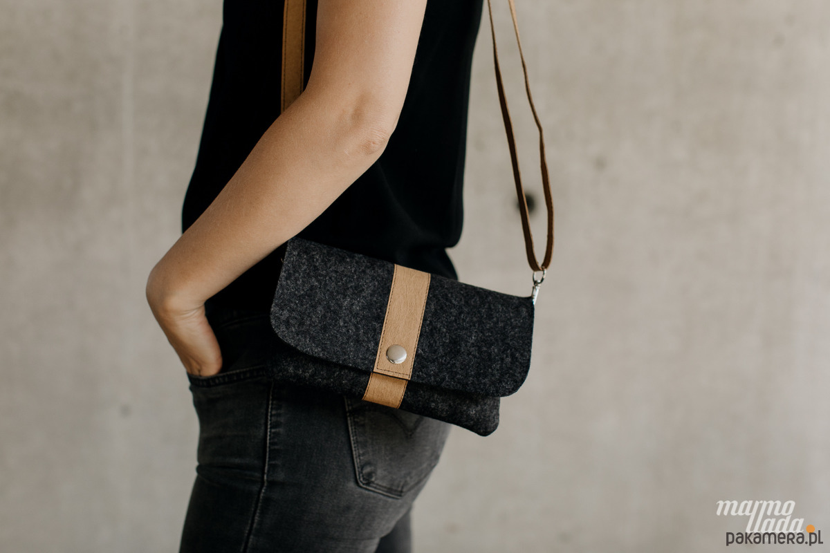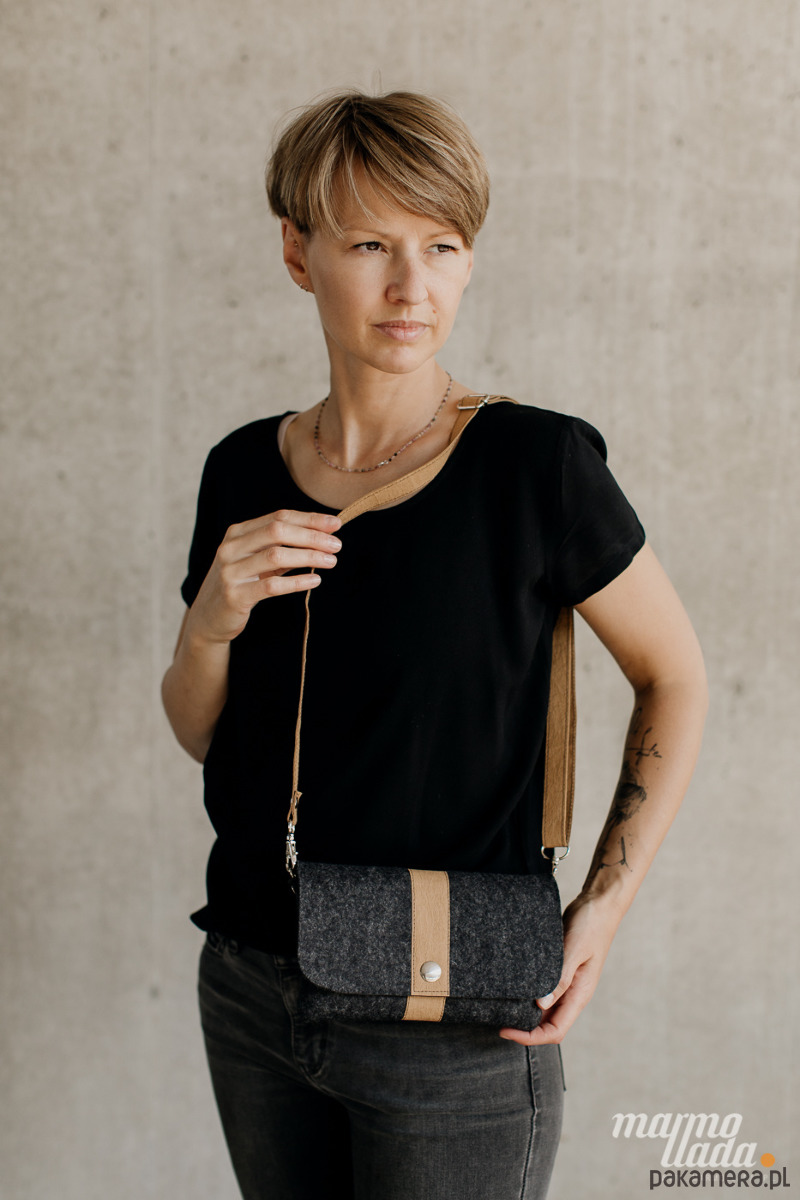 Niewielka torebka jest wykonana z grubego wełnianego filcu w kolorze grafitowym. Ma regulowany pasek wykonany z piaskowego papieru, jest zapinana na zatrzask. W zależności od potrzeby torebkę można nosić jako: