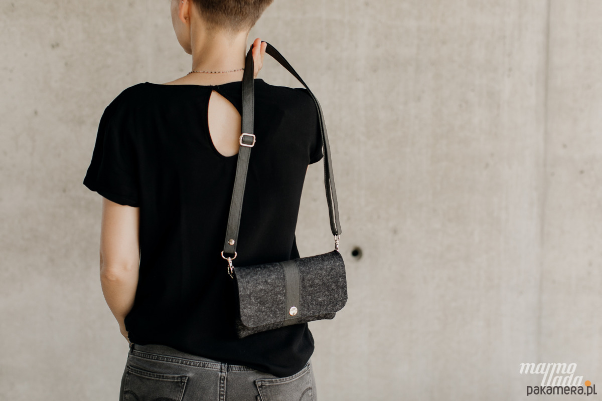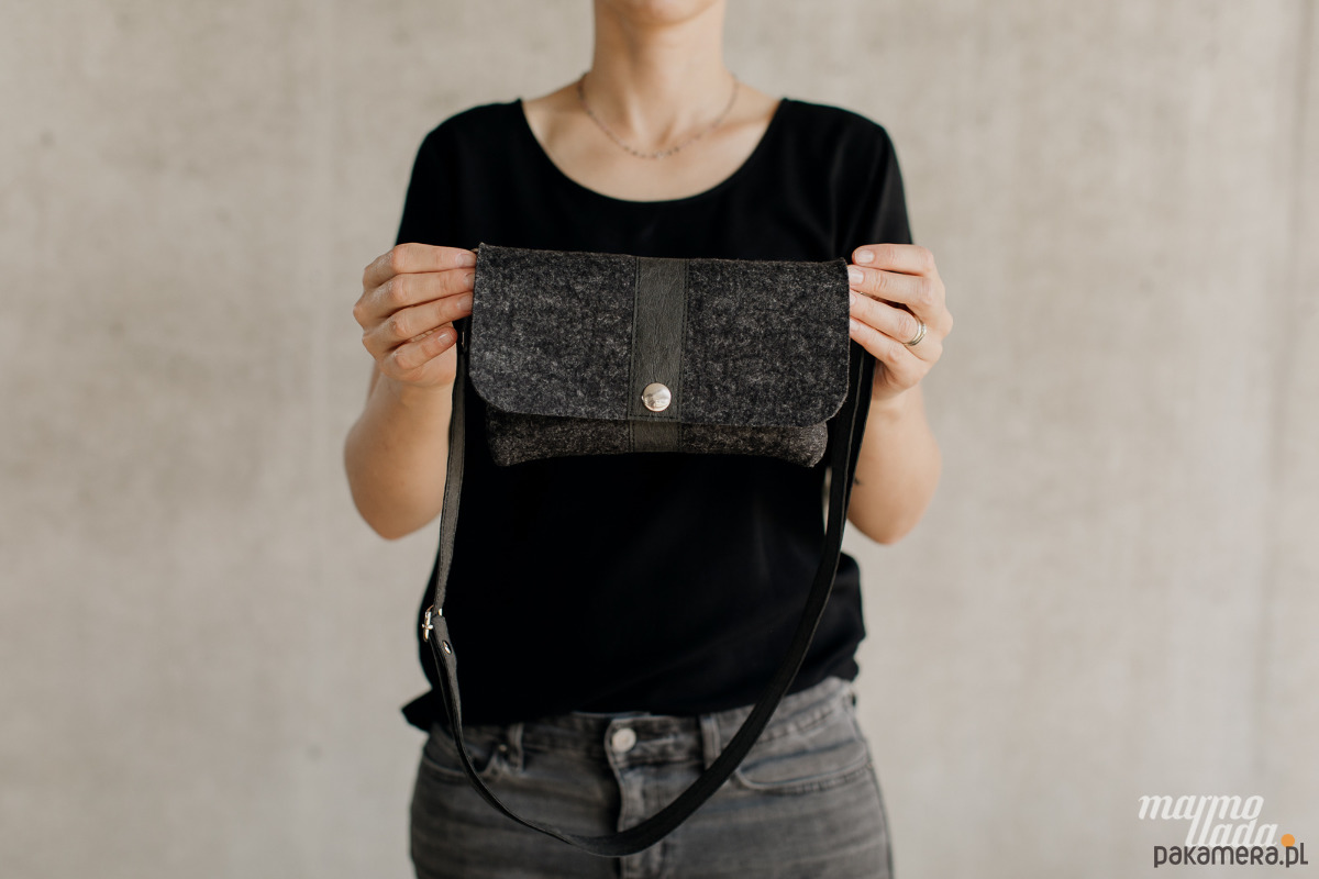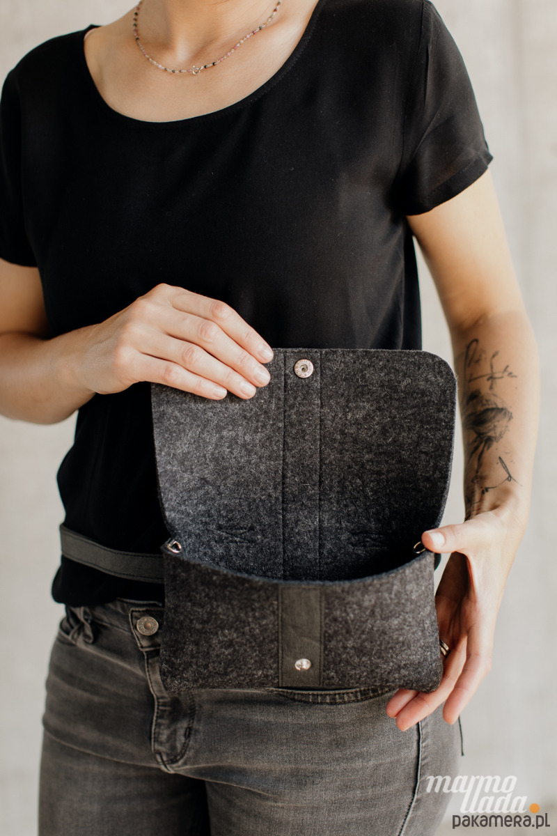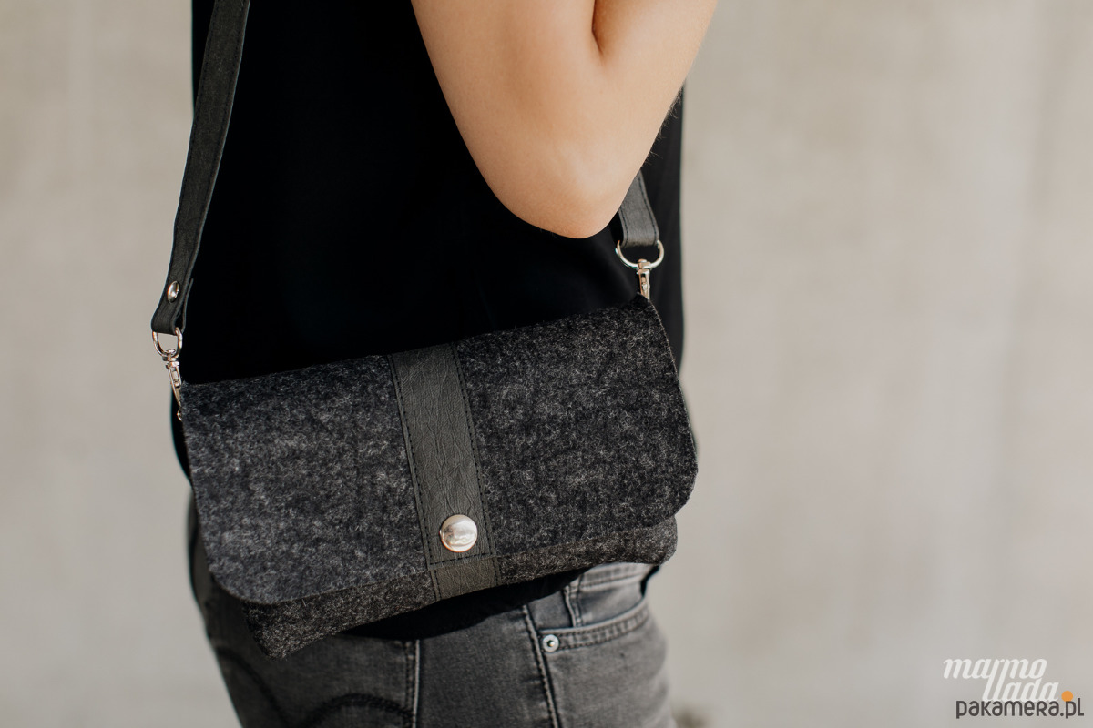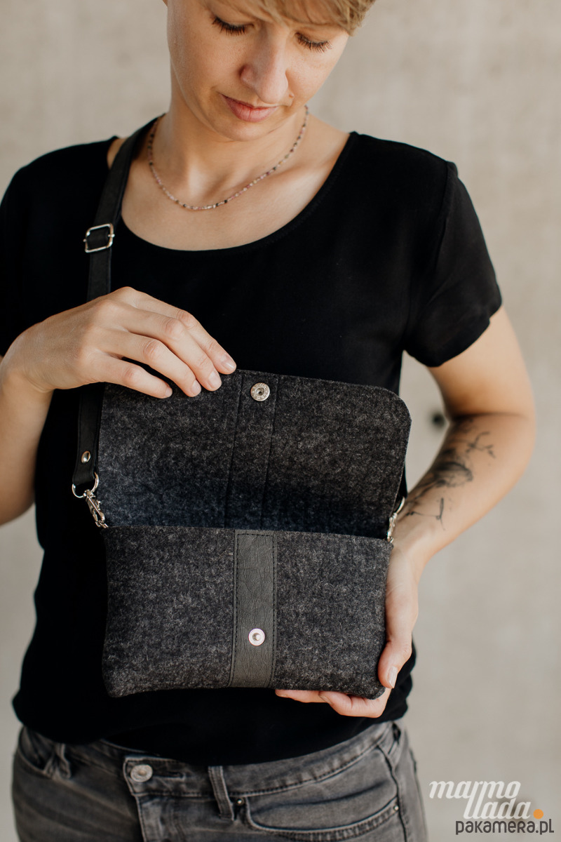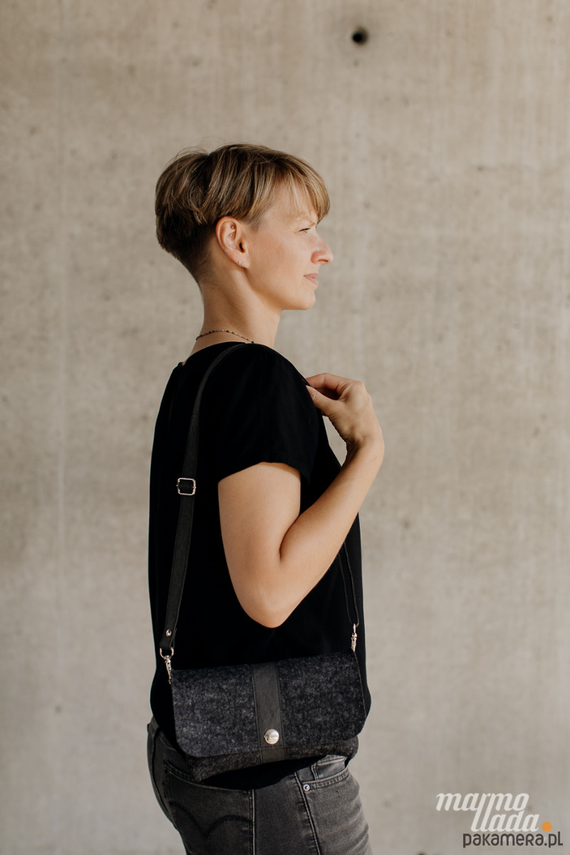 Niewielka torebka jest wykonana z grubego wełnianego filcu w kolorze grafitowym. Ma regulowany pasek wykonany z czarnego papieru, jest zapinana na zatrzask.. W zależności od potrzeby torebkę można nosić jako: